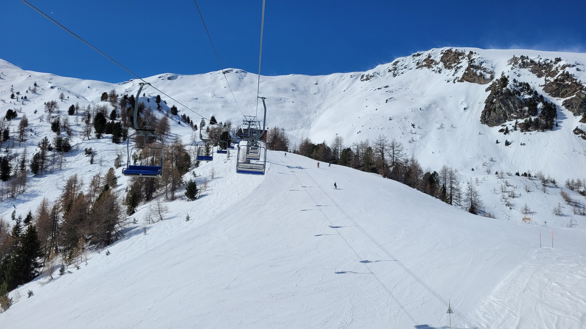 1/3/4 waren gut, die 2 war oben etwas bröckelig und unten mit Sulzbuckeln, da hier viele Leute gefahren sind. Komischerweise gibt es aber einige wenig befahrene Pisten, die sich besser gehalten haben. An der Bergstation der Zubringerbahn war der Schnee schon etwas knapp. Am Leissé-Sessel hielt sich der Andrang in Grenzen, ich bin dann Richtung Grimondet, der auch eher selten geöffnet ist.