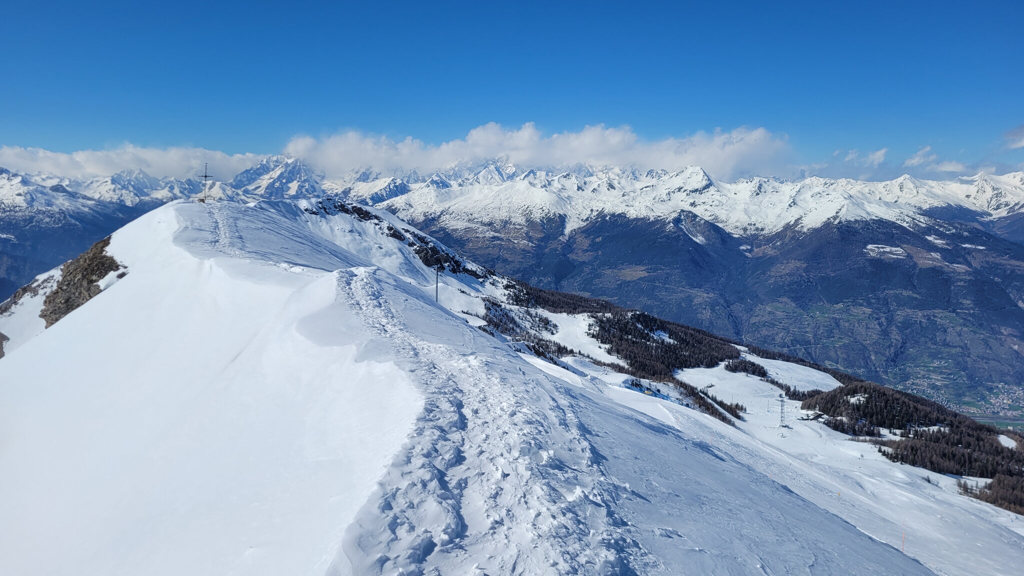 Aufgrund der Bauarbeiten am Gipfel war leider die schwarze Piste 27 nicht offen, das Zubringer-Laufband wurde schon abgebaut. Am Nachmittag zeigte sich das Matterhorn, allerdings frischte der Wind auch auf, so das nach 15h die Pisten oben etwas abgeblasen waren. Aber immer noch griffig genug. Weiter unten war es am Nachmittag überall sulzig, die flacheren Pisten hatten sich besser gehalten. Die viel befahrenen steileren Hänge waren verbuckelt, z.B. die 5 an Nuova. Hier hab es am Ende noch eine weitere blaue Variante, die merkwürdigerweise kaum befahren wurde. 16h bin ich dann wieder runter. Alles in allem fand ich den Tag ziemlich gut, am Morgen war der untere Teil noch gut und am Nachmittag hat der obere Teil auch noch Spass gemacht. Die milden Temperaturen waren nicht ganz optimal, aber in Cervinia wäre es heute nicht besser gewesen. Wettertechnisch war Pila sicher heute der beste Spot im Aostatal. Ich mag auch die Kombination aus Waldpisten und das Panorama vom Mont Blanc zum Matterhorn.