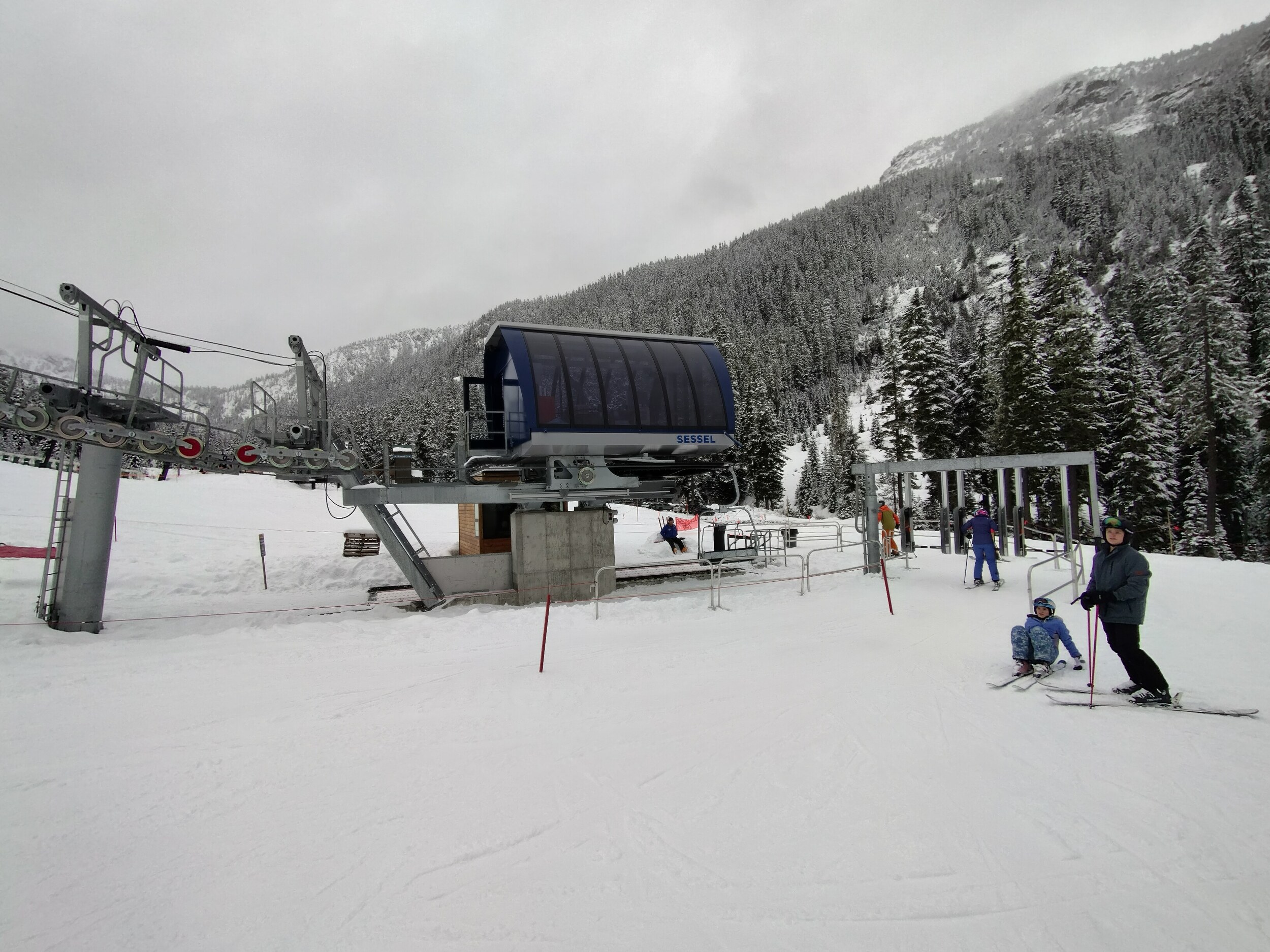 Oberhalb des Armstrong-Express gibt es eine weitere moderne 3SB von Dopplmayr namens Edelweiss, der im letzten Sommer neu gebaut wurde. Das Gelände unter dem Lift sieht spannen aus, bräuchte aber auch viel mehr Schnee: