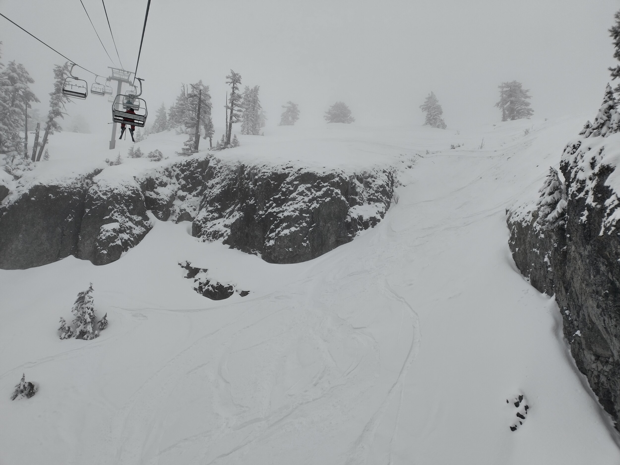 Blick aus dem Armstrong Express, dem einzigen kuppelbaren Lift auf die leichteren echten Abfahrten. Bis auf einen Anfängerhang ganz am Rand ist hier alles mindestens "Mittelschwer". Da auch nichts präperiert ist aber nicht wirklich mit roten Pisten in Europa vergleichbar. Die Buckel sind eisig, mit ein paar Zentimeter Neuschneeauflage. Mit der richtigen Buckeltechnik erstaunlich gut zu fahren!