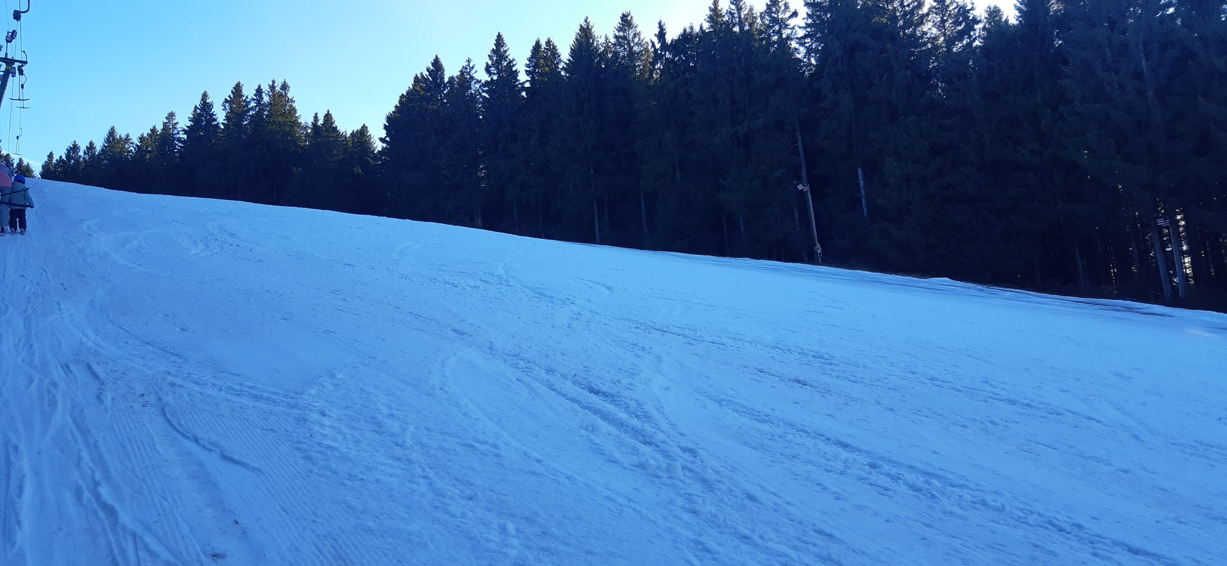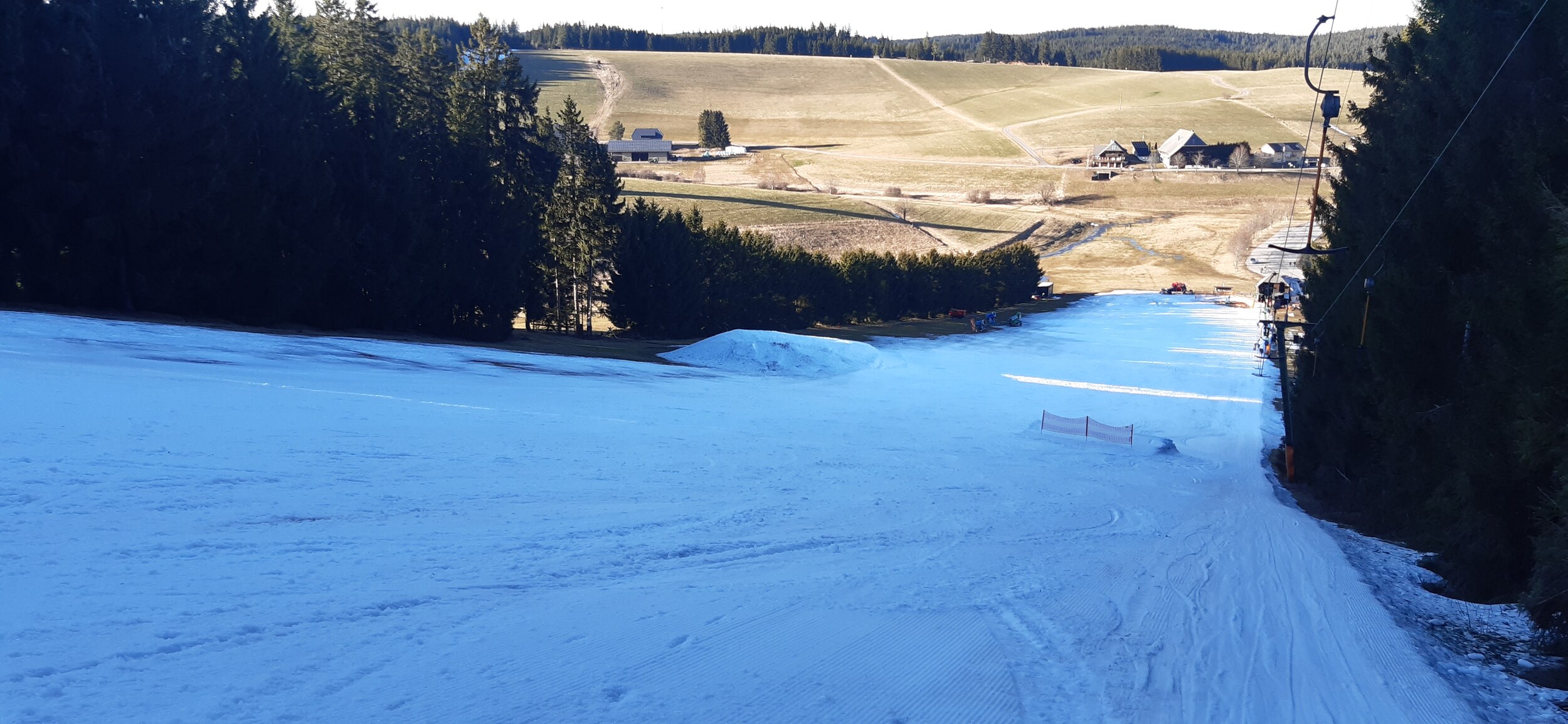 Ziel heute der Rösslelift im Weißenbachtal zu Schönwald. Dank Beschneiungsmöglichkeit und konsequenter Ausnutzung der Schneifenster kann man eine top Piste anbieten. Im Schnitt ist die Schneedecke noch 50cm dick, da wo mit dem Kunstschnee gearbeitet wurde. Man kann aber auch noch auf Nsturschnee fahren, das dürfte aber am Wochenende nicht mehr gehen.