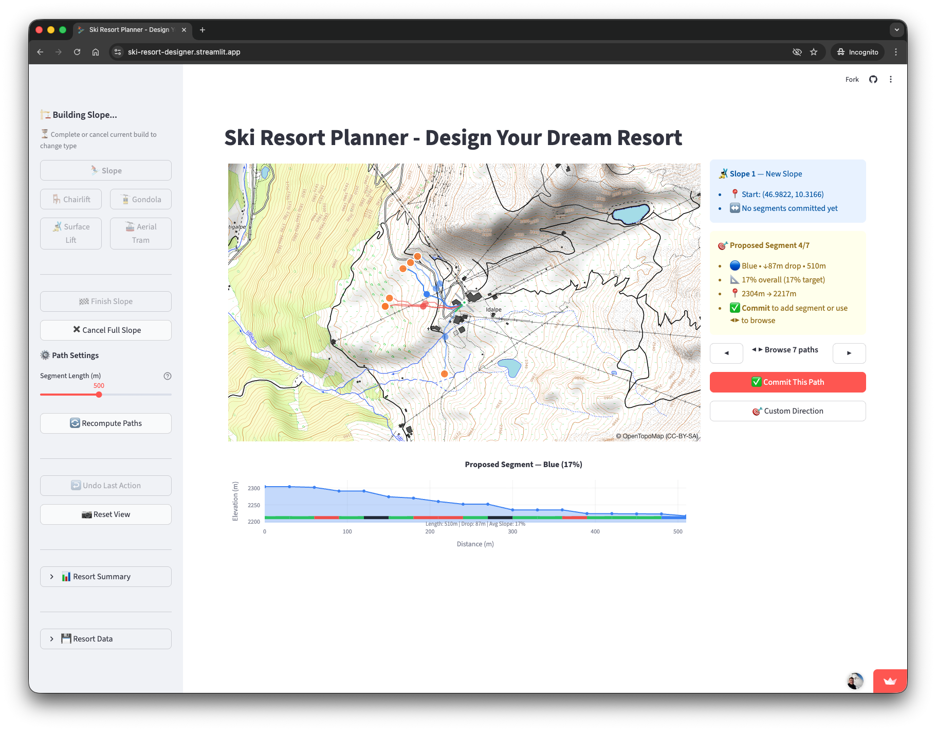 Ich bring die Pisten nicht so hin, wie ich sie möchte. Ich bin es mir halt von swisstopo und Google Earth gewohnt die Pisten selbst zu zeichnen und dann mit meinem Gefällerechner Script zu überprüfen. Da bin ich wesentlich schneller als immer Vorschläge rechnen zu lassen und dann einen auszuwählen. Ausserdem kann man bei beiden Tools die bestehenden Punkte schieben oder neue Stützpunkte dazwischen legen.