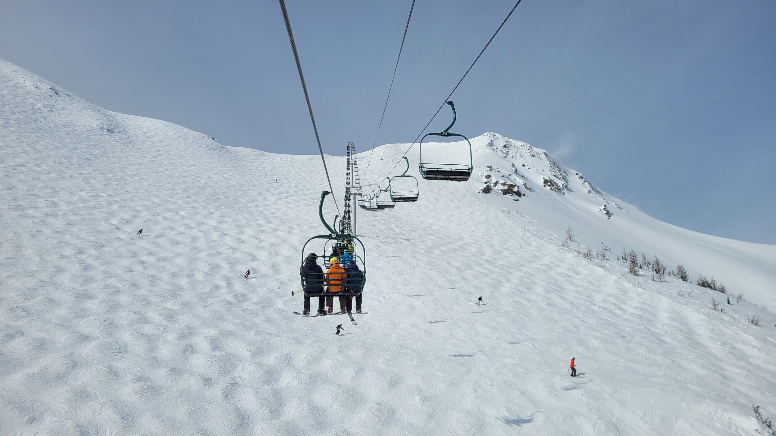 Links davon der fix geklemmte Discovery Quad: Die Base: Der Toby Chair ist nur ein kurzer Zubringer: Die zweite KSB Champagne Express: Hier waren die Pisten vormittags ziemlich hart. Das Wetter war sehr April-mäßig wechselhaft. Nach einem sonnigen Start zog ein kurzer Schneeschauer durch, danach wieder Sonne usw.