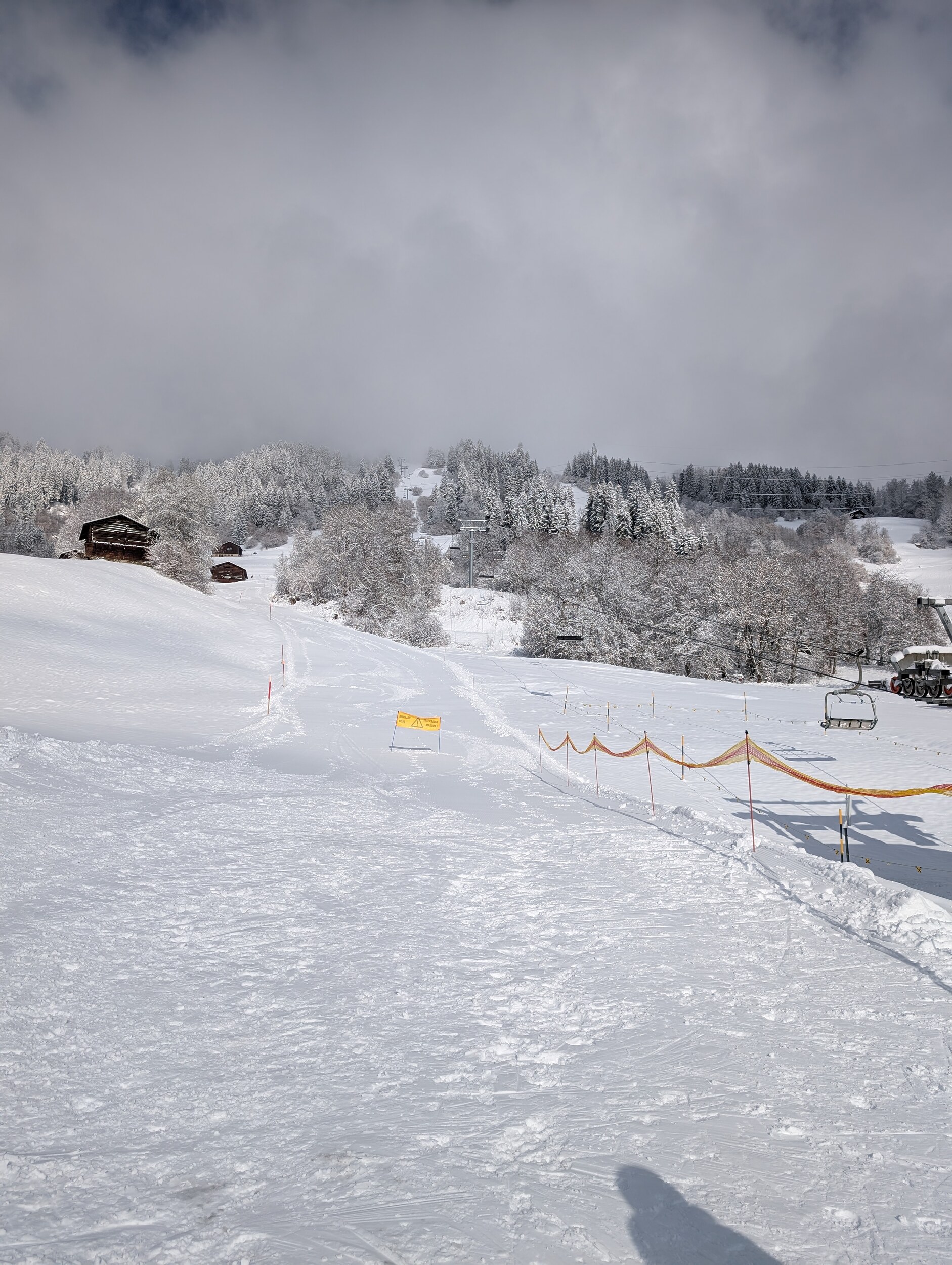 Danach fahren wir ganz hoch mit der zweiten langen 4KSB Sektion auf den Fil. Leider ist und bleibt dieser Bergrücken den ganzen Tag über in einer Wolke. Via Piste 9 und 6 fahren wir zur Alp Dado und danach weiter runter. Diesmal Richtung Talstation Brigels.