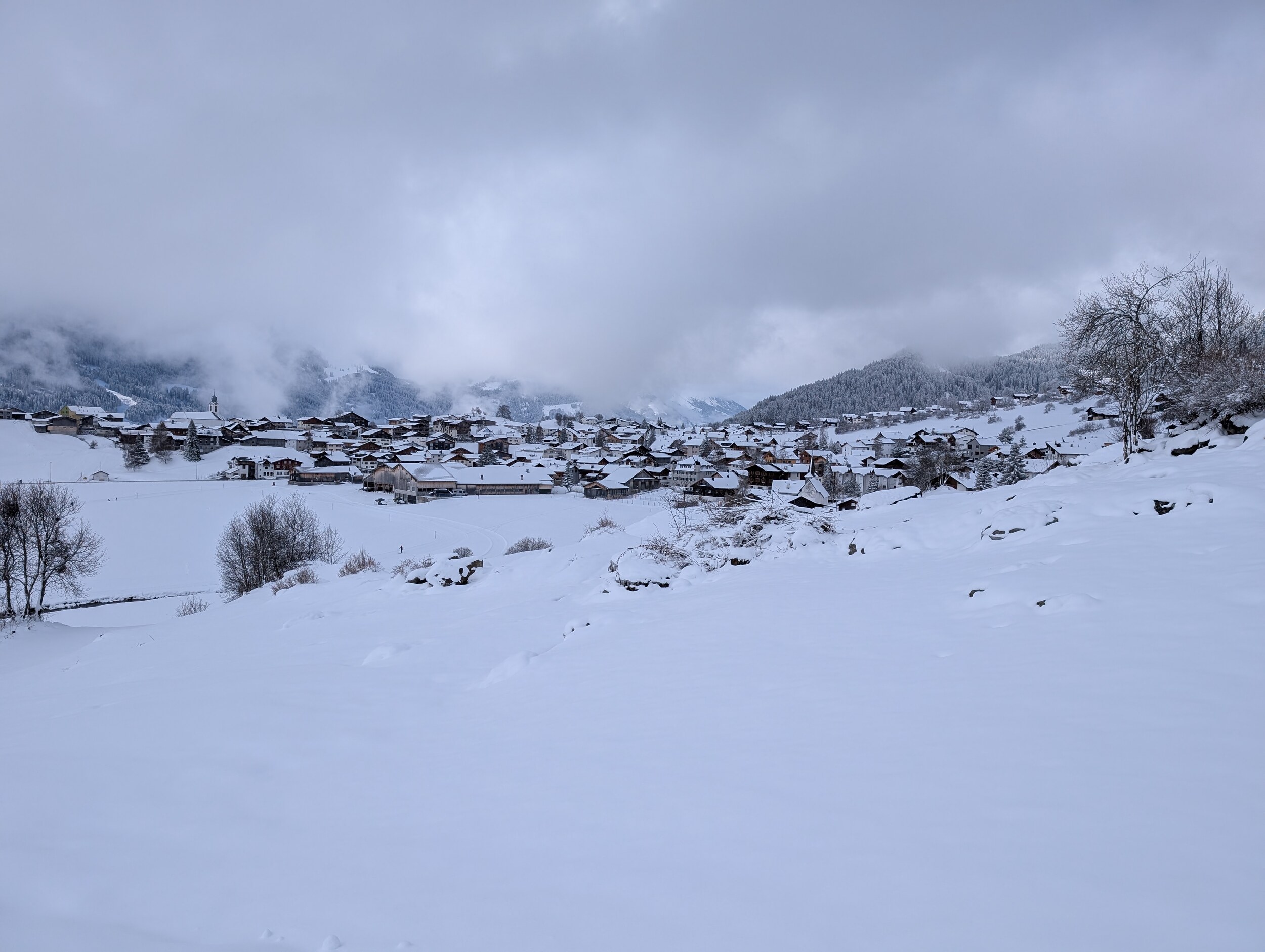Der nächste freie Termin war der 15.3. für welchen wir dann nach den Skiferien eine Nacht im Ucliva direkt an der Talstation Waltensburg gebucht haben. Wir hatten schon Angst, die warmen Temperaturen lassen den gesamten Schnee schmelzen aber schlussendlich kam es ganz anders. Neben der guten Lage bietet dieses Hotel auch ideale Zimmer für Familien. Aus terminlichen Gründen fuhren wir am Samstag Nachmittag los und kamen gegen 4 Uhr in Waltensburg an. Nach der Ankunft machten wir bei dichten Schneetreiben einen Spaziergang Richtung Brigels. Die grünen Wiesen wurden Zusehens weisser, auf etwa halber Strecke kehrten wir wieder um. Bereits als wir wieder zurückkamen hatte sich die Frühlingslandschaft wieder in eine Winterlandschaft verwandelt.