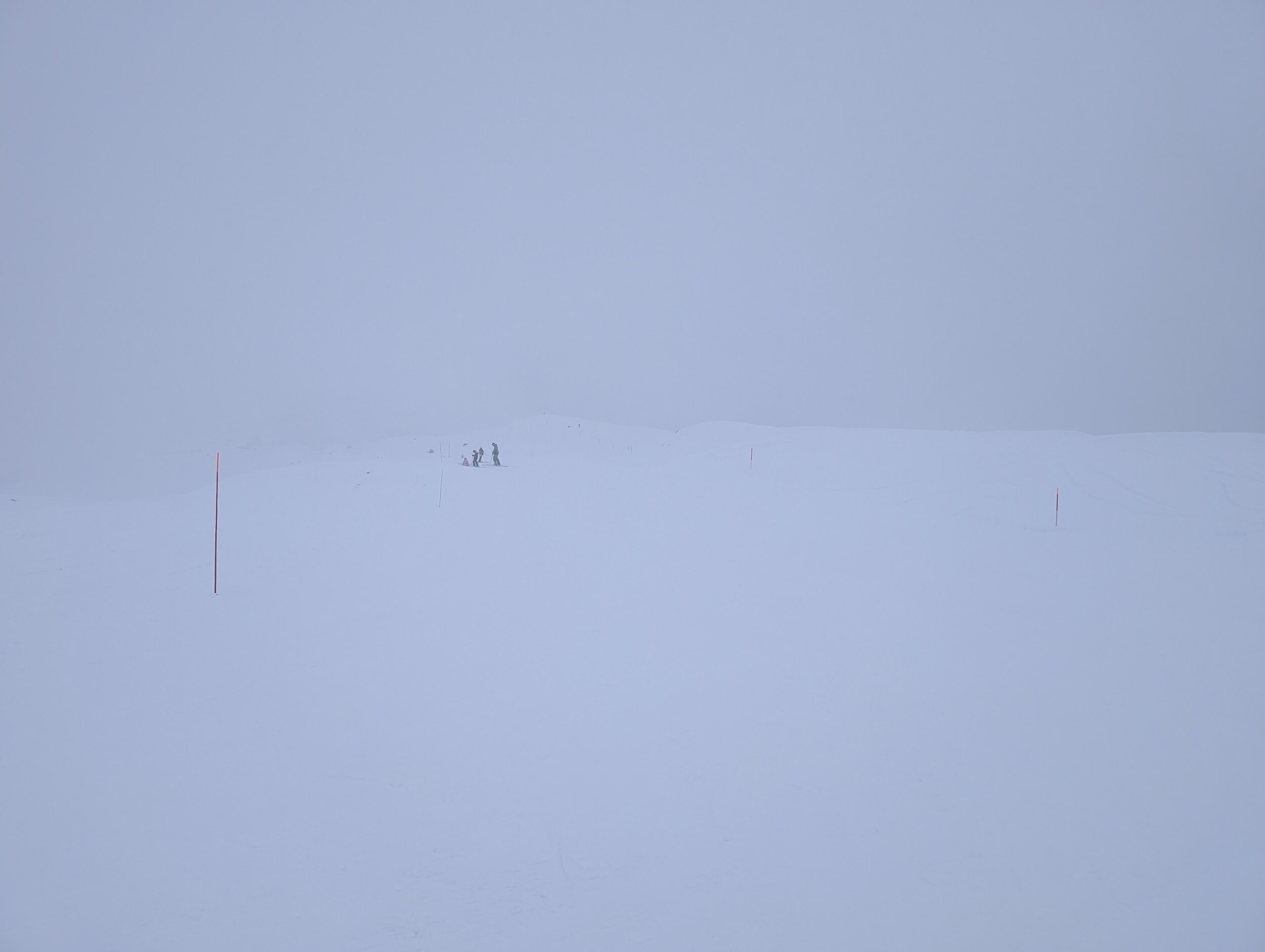 Da wir keine Orientierung mehr haben und die Pisten eh alle gleich aussehen, fahren wir wieder über die 9 und dann 6 ab. Mehrmals lande ich neben der Piste, weil ich auf der falschen Seite des Posten vorbei will.