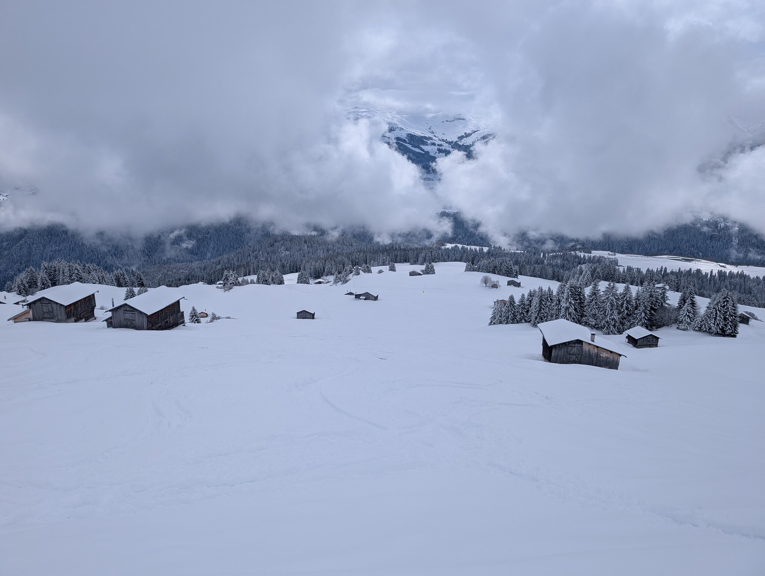 Über den Zwischeneinstieg fahren wir zu Alp Dado um Mittag zu essen. Wir haben noch kurz die Hoffnung, es möge doch noch auftun auf dem Fil. Leider war er aber auch nach dem Mittag immer noch komplett in der Wolke.