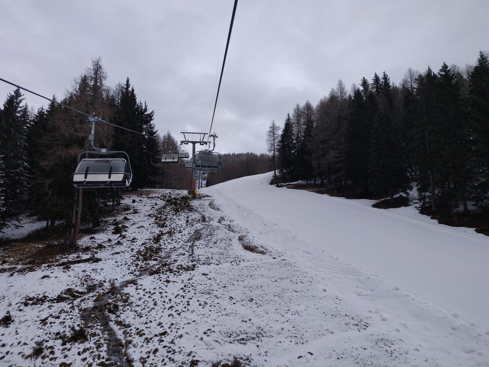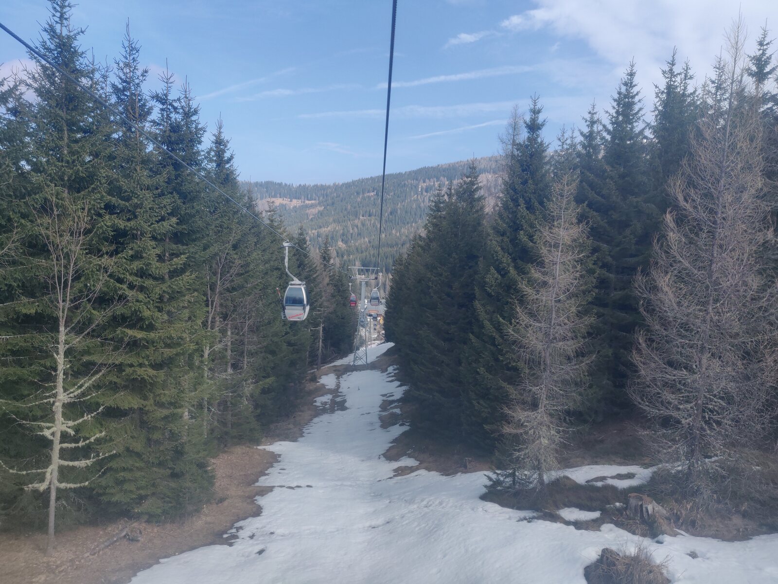 Heute geht es nach längerer Zeit wieder auf die Gerlitzen. Hauptgrund dafür ist die kurze Anreise, außerdem ist etwas stärkerer Wind und Schnee/Regen gemeldet. Obwohl es auf der Gerlitzen gut blasen kann, hat sie normalerweise immer noch am längsten auf. Manchmal steht dann halt bei der Klösterle II, dass die Bergfahrt wegen Wind 30 Minuten dauert, aber immerhin fahren sie noch. ^ Ich starte wieder bei der Kanzelbahn. Der Parkplatz ist um 8:30 noch sehr leer und ich kann auf der obersten Parkebene parken. ^ Vergleichsfoto zu Dezember. An der Gipfelbahn auf ca. 1500m Seehöhe liegt neben der Piste praktisch kein Schnee mehr. Die Piste ist aber noch gut eingeschneit