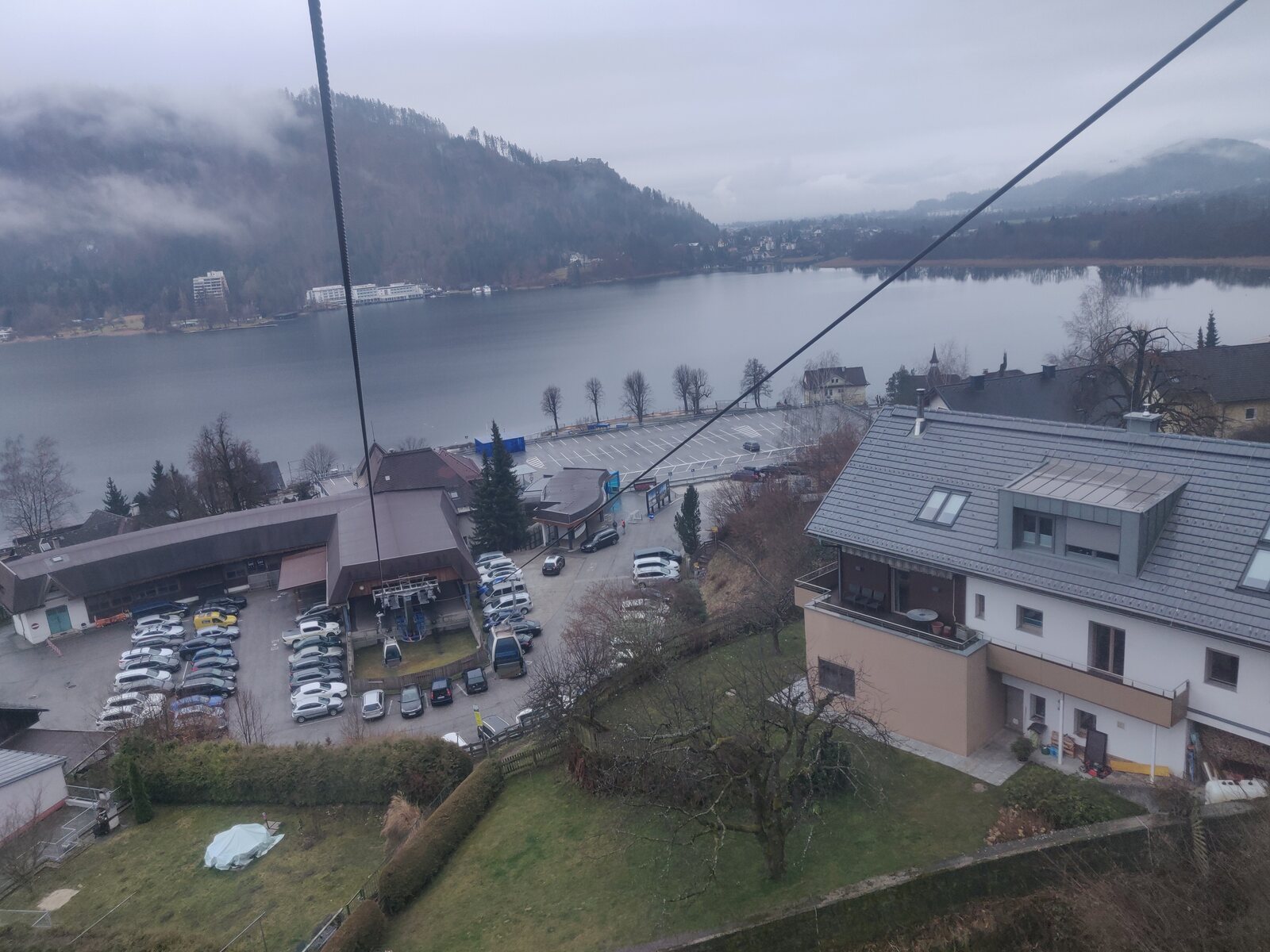^ Talfahrt mit der Kanzelbahn. Während wir oben Ski fahren, sind im Ossiachersee bereits ein paar Windsurfer unterwegs.