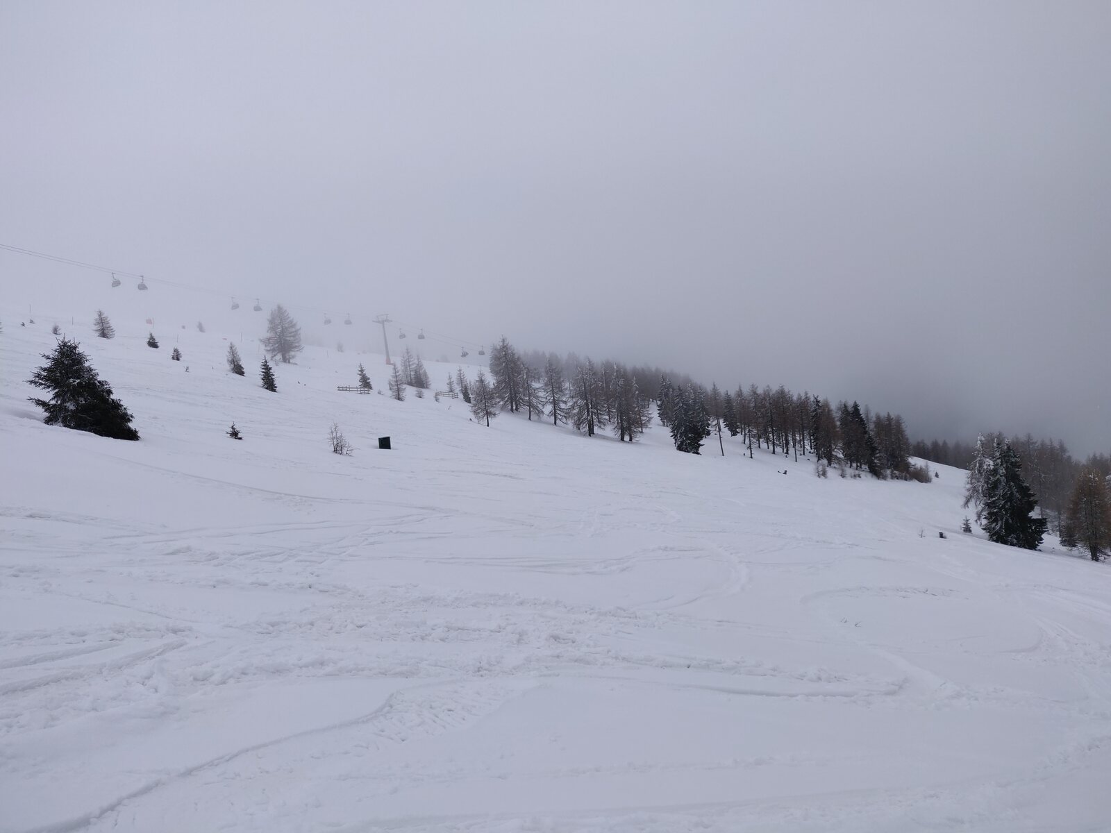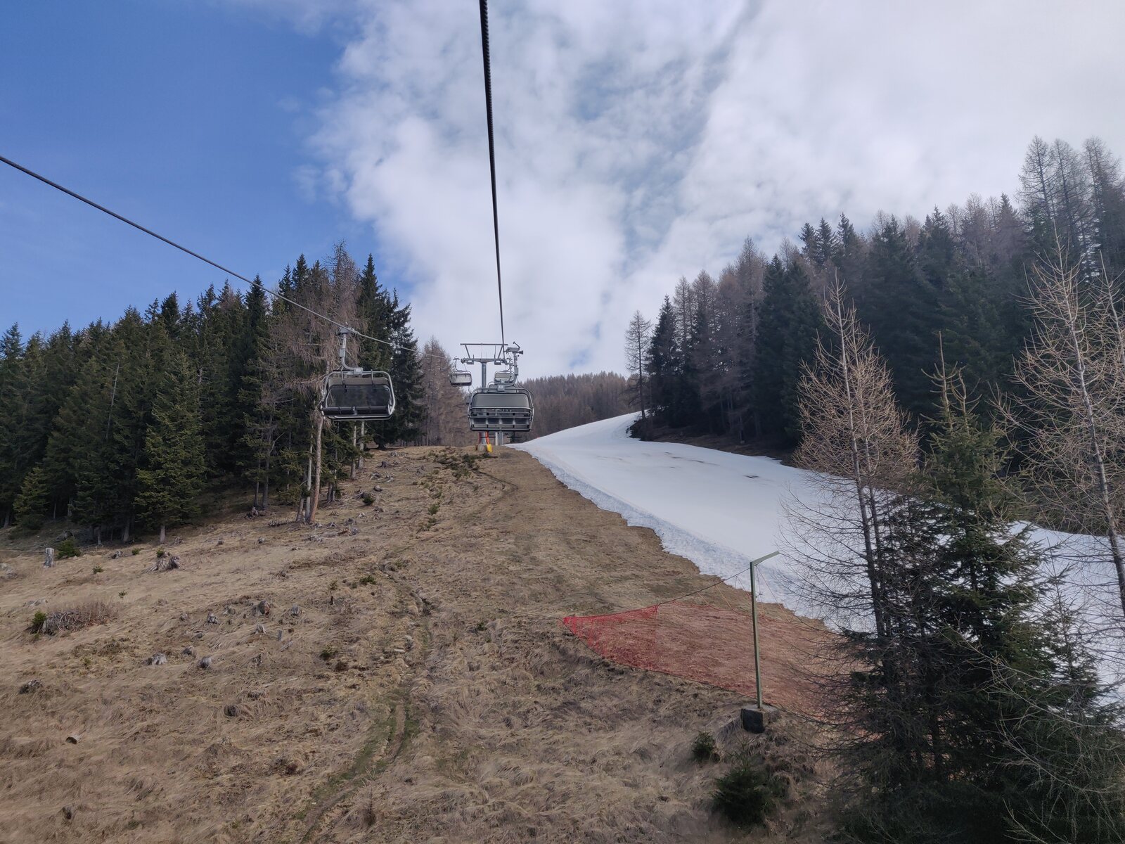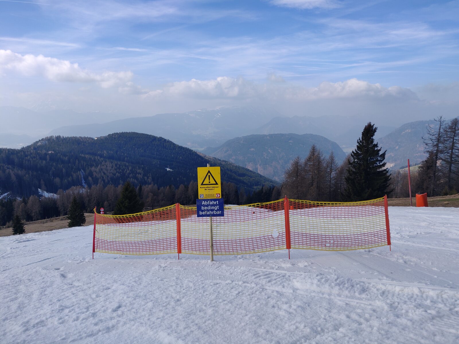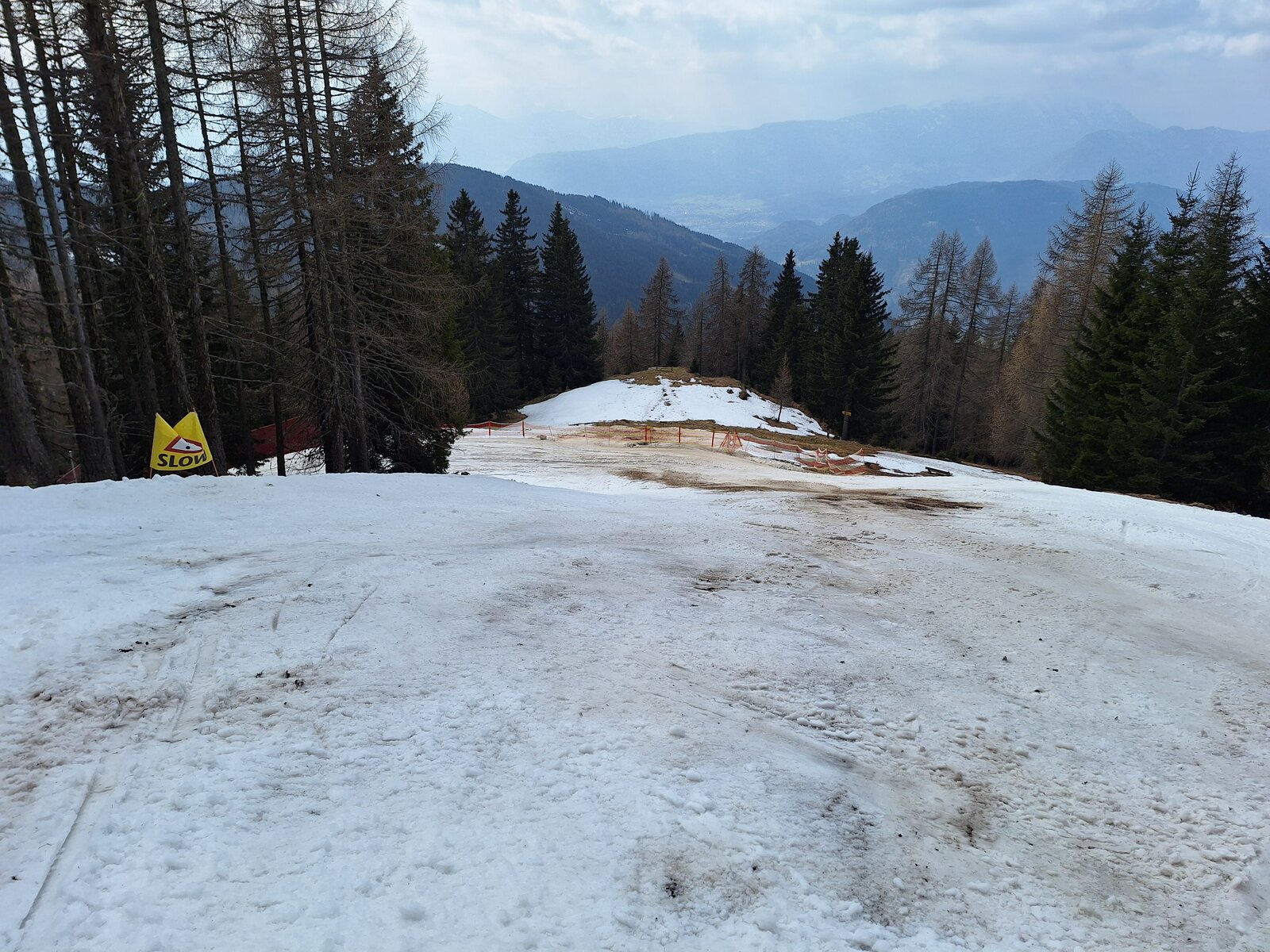 . Die Piste selbst ist bis auf ein zwei schmale braune Stellen aber noch gut zu fahren und wegen der Tafel fahren auch weniger Leute hier.