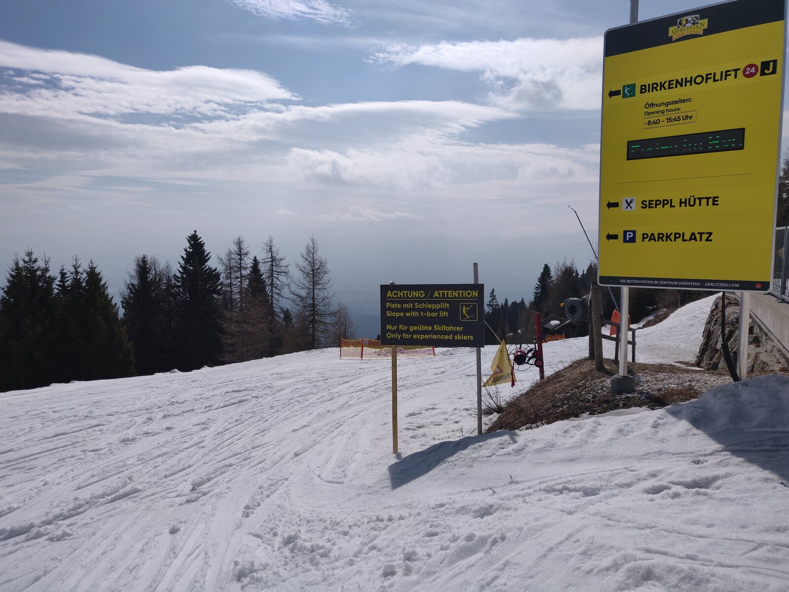 Heute ging es für 3 Stunden über Mittag auf die Gerlitzen. Wetter strahlend blau und warm. Auf den sonnseitigen Pisten war Frühlingsskifahren angesagt, mit einer leichten Sulzschicht drauf. ^ Der Pacheiner Schlepplift ist nun auch geöffnet. ^ Beim Neugarten wurde etwas gespart und es wurden nur ca. zwei Drittel der Piste präpariert, obwohl sie bis zum Wald ausgesteckt war. ^ Klösterle I ist jetzt etwas breiter. Der Regen der letzten Woche hat aber seine Spuren hinterlassen. Teilweise kamen ein paar Eisplatten zum Vorschein. ^ Klösterle II ist auch breiter geworden. ^ Die zweite Piste war präpariert aber abgesperrt. Ich war nicht der Einzige, der die Gesperrttafel nicht gesehen hat. Im Flachen war die Piste sehr schön, im Steilhang noch knollig. ^ Am Weg zum Birkenhoflift. Heute musste man nicht anstehen ganz im Gegensatz zu gestern