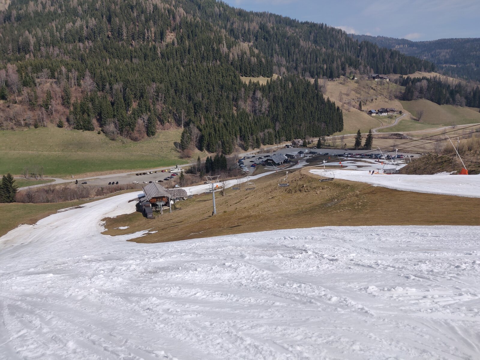 Heute kommt aufgrund der kurzen Anfahrt und der Wettervorhersage die Gerlitzen wieder zum Zug. Es sind um die 50km/h Wind angesagt, daher habe ich den Katschberg und die Turrach "aussortiert". Die Gerlitzen hält bei Wind meistens länger durch als die anderen beiden Gebiete. Mal schauen wie es dann tatsächlich wird. ^ Wir starten wieder an der Kanzelbahn. Um diese Jahreszeit kann man auch um 9:30 noch unten ankommen und einen Parkplatz bekommen. Weiterer Vorteil ist, dass die Parkplätze auf dem Parkhaus alle asphaltiert sind und man sich so auch etwaigen Matsch erspart. ^ Für den Vergleich wieder ein Foto von der Piste Nr. 4 bei der Auffahrt mit der Gipfelbahn. Bereits leicht braun. ^ Oben sieht es noch winterlich aus, mit Schnee auch abseits der Pisten. ^ Blick in Richtung Süden. Hier sieht das Wetter schon nicht mehr so gut aus. ^ Auf einer weichen Piste geht es gleich einmal runter zur Gipfelbahn. Beim Start wird darauf hingewiesen, dass die Piste Nr. 4 ist nur noch "bedingt befahrbar" ist. Finde ich grundsätzlich gut, dass die Pisten nicht beim ersten braunen Fleck komplett gesperrt und nicht mehr präpariert werden