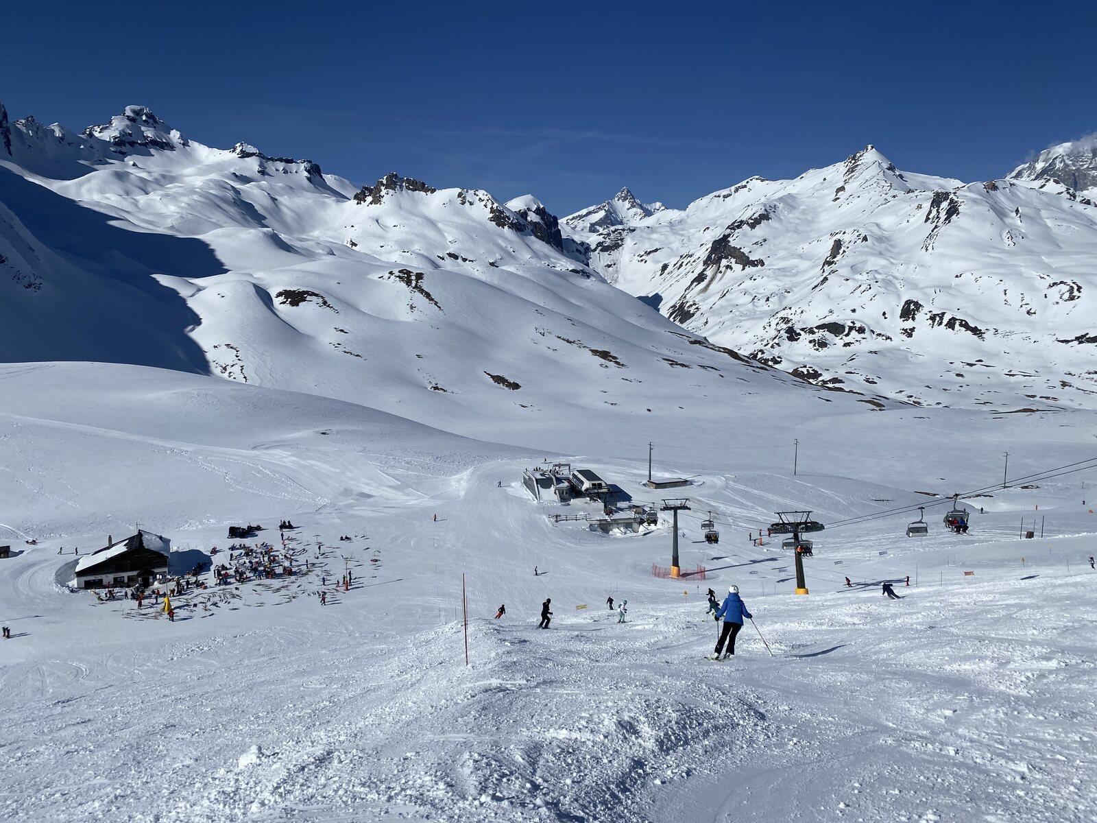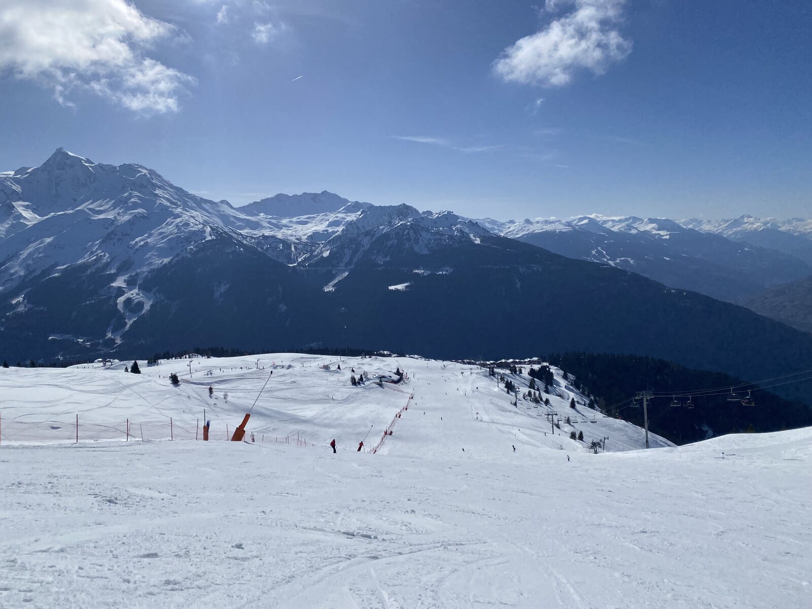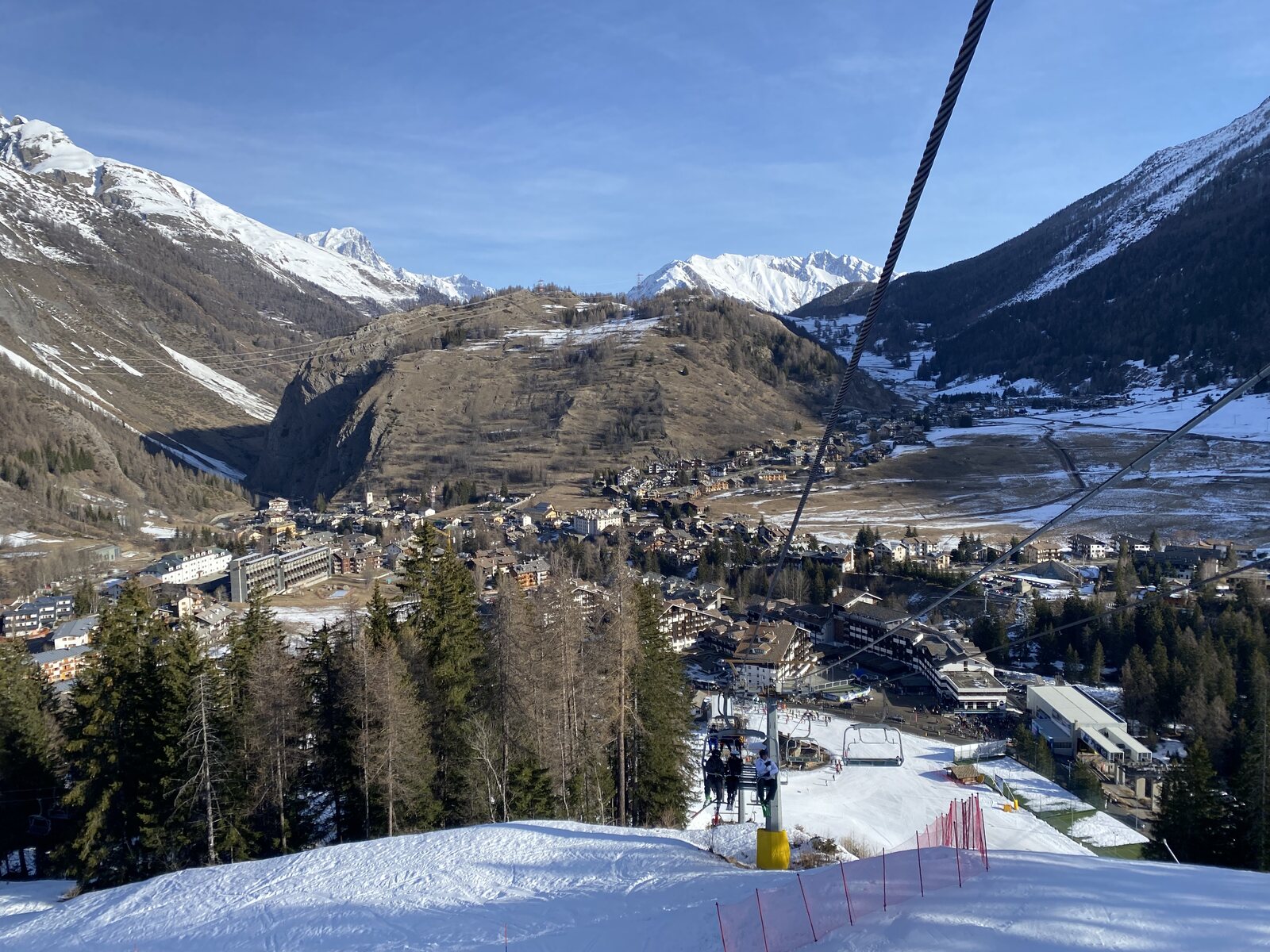 Sehr schön ist auch die erweiterte Abfahrt "Roc Noir" in Kombination mit "Marmottes", welche unten an einer alten 3er Krücke von Montaz Mautino endet. Dort ist es gefühlt schon Frühling. So konnten wir auch der lahme Fahrt mit der "Petit Bois" Sessel geniessen...