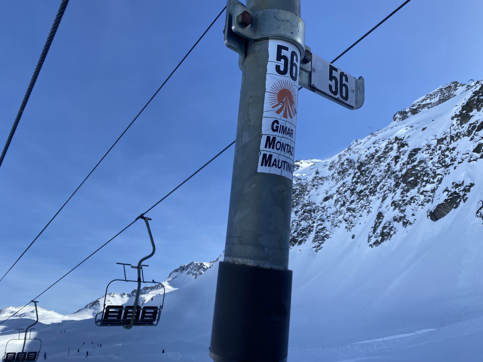 Oben entschieden wir zunächst nach Frankreich zu fahren. Bis jetzt waren wir nahezu nur Lift gefahren und wollten endlich mal Meter machen. Mario vertraute blindelings meine Ortskenntnisse aus 2019. Zunächst fahren wir den fixen 4er "Belvedere" und anschliessend eine lange flache aber lässige blaue Abfahrt, wo sich unterwegs auch die Staatsgrenze befindet. Grad erst in Frankreich angekommen, und schon wird man mit eine fixe 3er Krücke von Gimar Montaz Mautino begrüsst. Doch man darf sich durch die alte 3-SB nicht täuschen lassen: Der Französische Teil vom Gebiet ist erheblich moderner und hat Dank viele 6-KSB Anlagen auch eine höhere Kapazität. Ausserdem weisst ein Banner darauf hin, dass auch für die 3-SB bereits eine 6-KSB als Ersatzbahn geplant wurde.