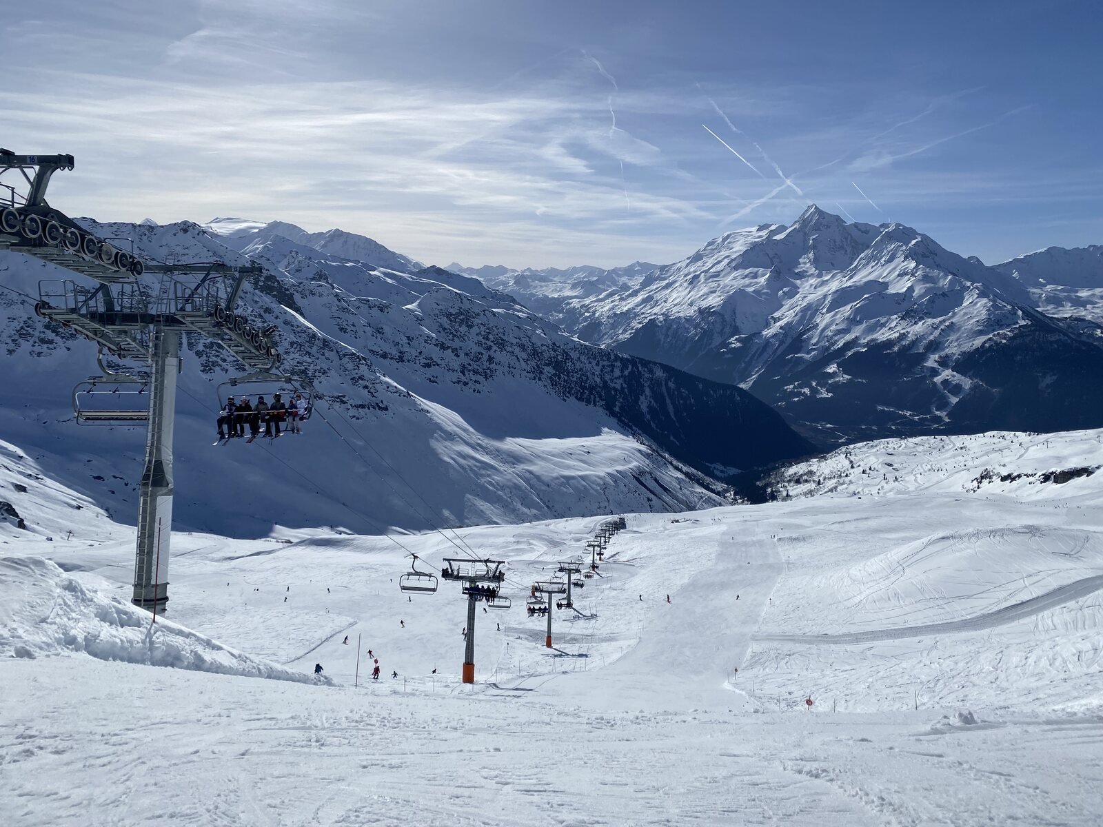 Das war nicht unbedingt die beste Wahl. Vor dem 4-KSB Chaz Dura Express, welche übrigens ein Zwischenein- und ausstieg besitzt die aktuell geschlossen war, stand eine ordentliche Schlange. Während wir warteten viel der eine nach der andere Skifahrer kurz vor der Warteschlange auf dem Hintern. Etwas amüsant zum anschauen. Die meisten Skifahrer scheinen hier wohl nicht viel können mit zu bringen. Doch der Gedanke, dass wir wohl besser die fixe 3-SB La Combe und Chaz Dura hatten nehmen sollen, verschwand sobald wir in der 4-KSB sassen. Das ging vieeeel schneller als die zwei lahme Krücken. Anstehen hat sich also gelohnt. Und wir wussten zum diesen Zeitpunkt noch nichtmal, dass es schon die letzte Warteschlange des Tages war.