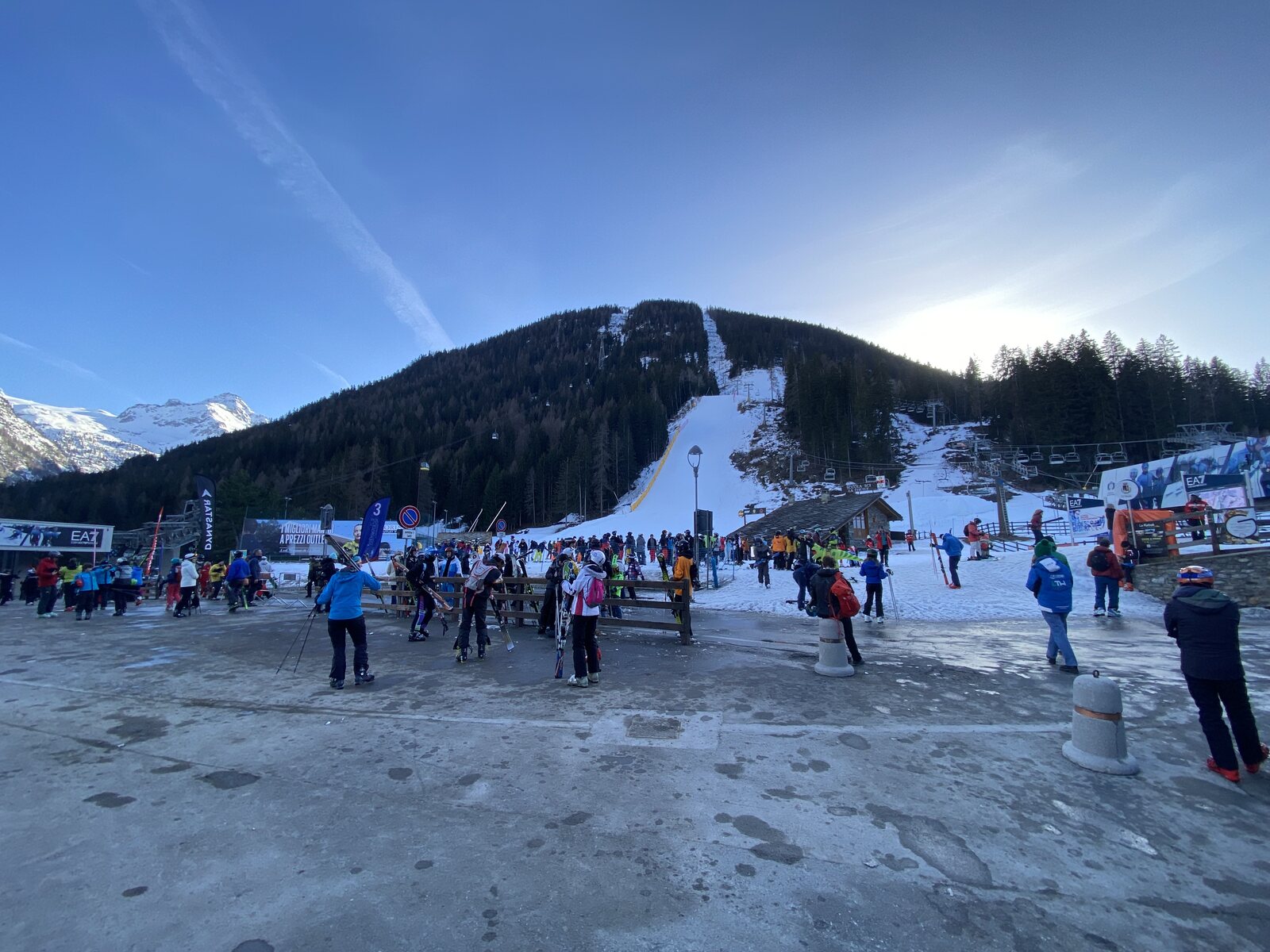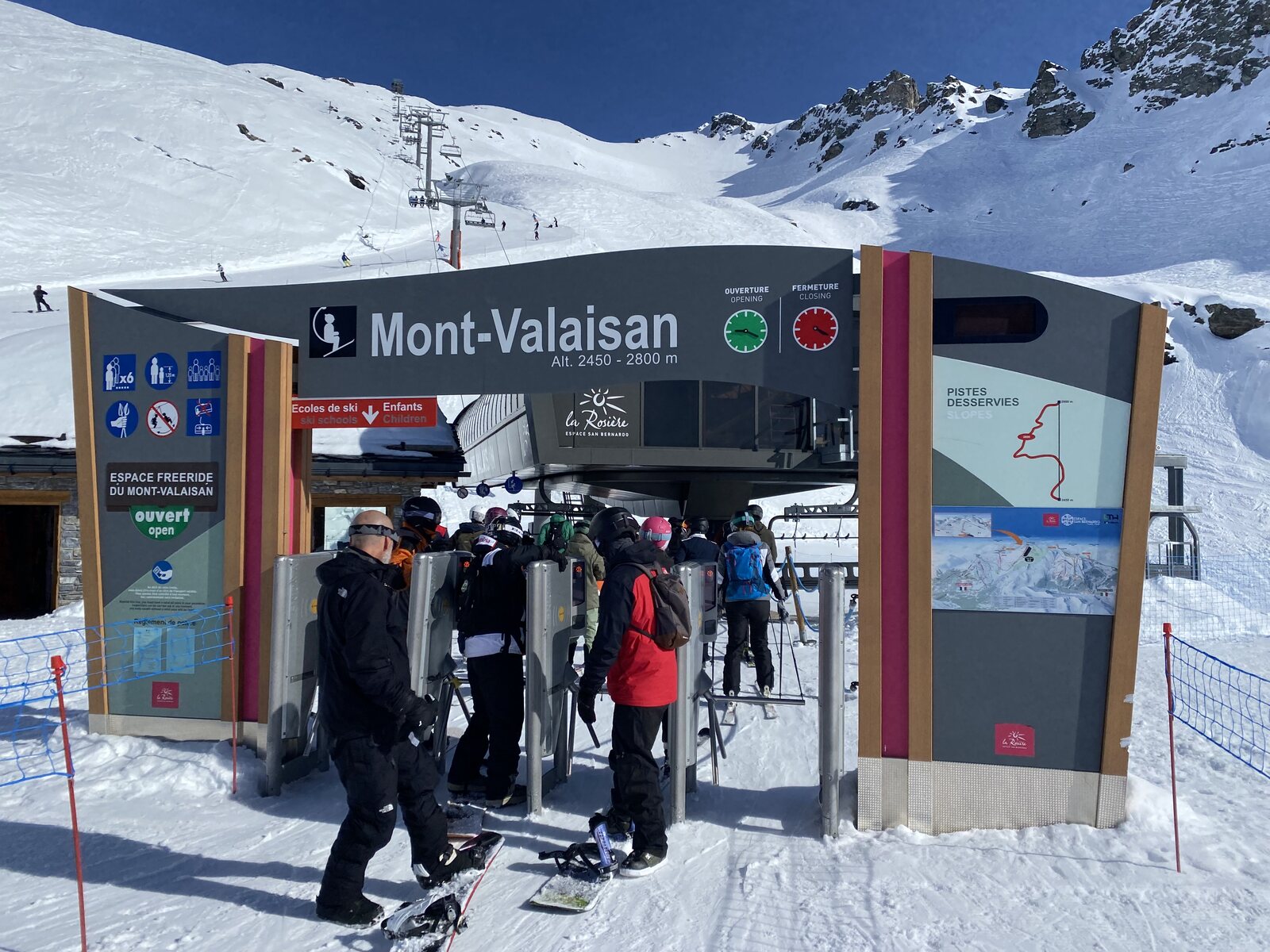 Nach einen Fussmarsch von 800 m - und eine gesamte Verspätung von etwa 1:15 Std - erreichten wir dann endlich die Talstation. Wir entschieden uns für den 4-KSB "Bosco Express" anstatt EUB. Vor dem Lift war ein Chaos, aber nicht mit wartende Personen vor dem Lift. So konnten wir uns durch die Menschenmassen hindurch zur Lifteinstieg manövrieren. Es war kurz noch spannend ob mein SwissPass auch die Aufladung mit ein regulären Skidata-Nummer ins Ausland mitmacht, aber in der Tat war das gar kein Thema. Und schon sassen wir in der etwas unbequeme Sessel nach oben.