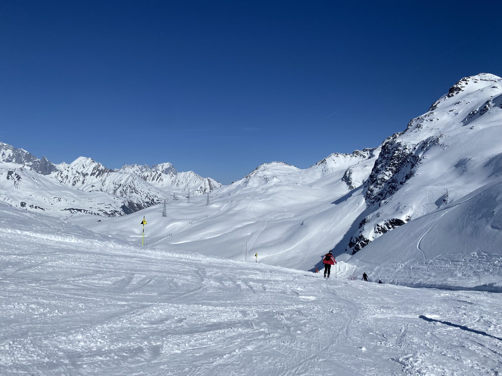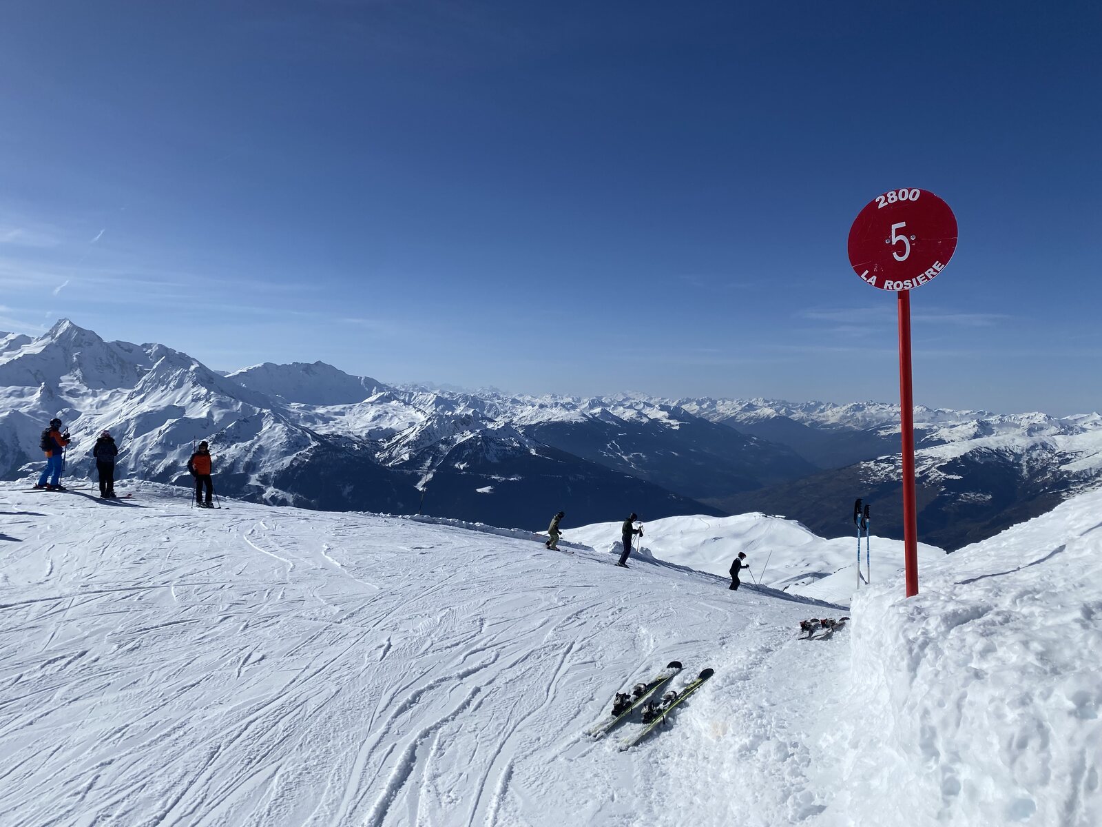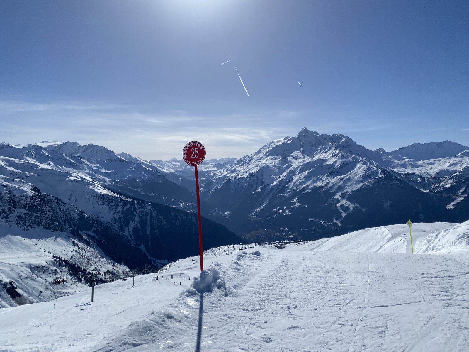 Nachdem wir nochmals mit der 6-KSB "Eucherts" hoch gefahen sind, entscheiden wir uns einmal nach "La Rosière" hinunter zu fahren. Es wartete die beste Abfahrt des Tages auf uns. Zwar weich, aber überhaupt noch nicht verbuckelt und perfekt für schöne Schwünge. Dazu auf der Piste kaum was los. Wiederum ein wahrer Genuss!