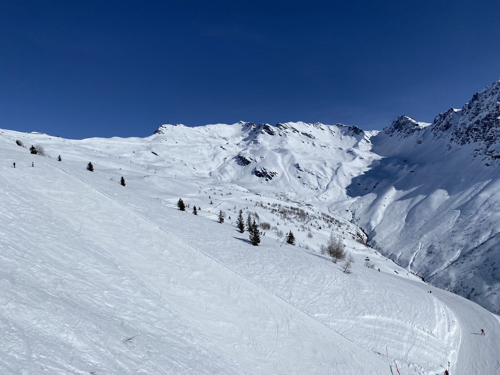 Schön aufgeweichte "Marmottes" Piste mit herrlichen Ausblick!