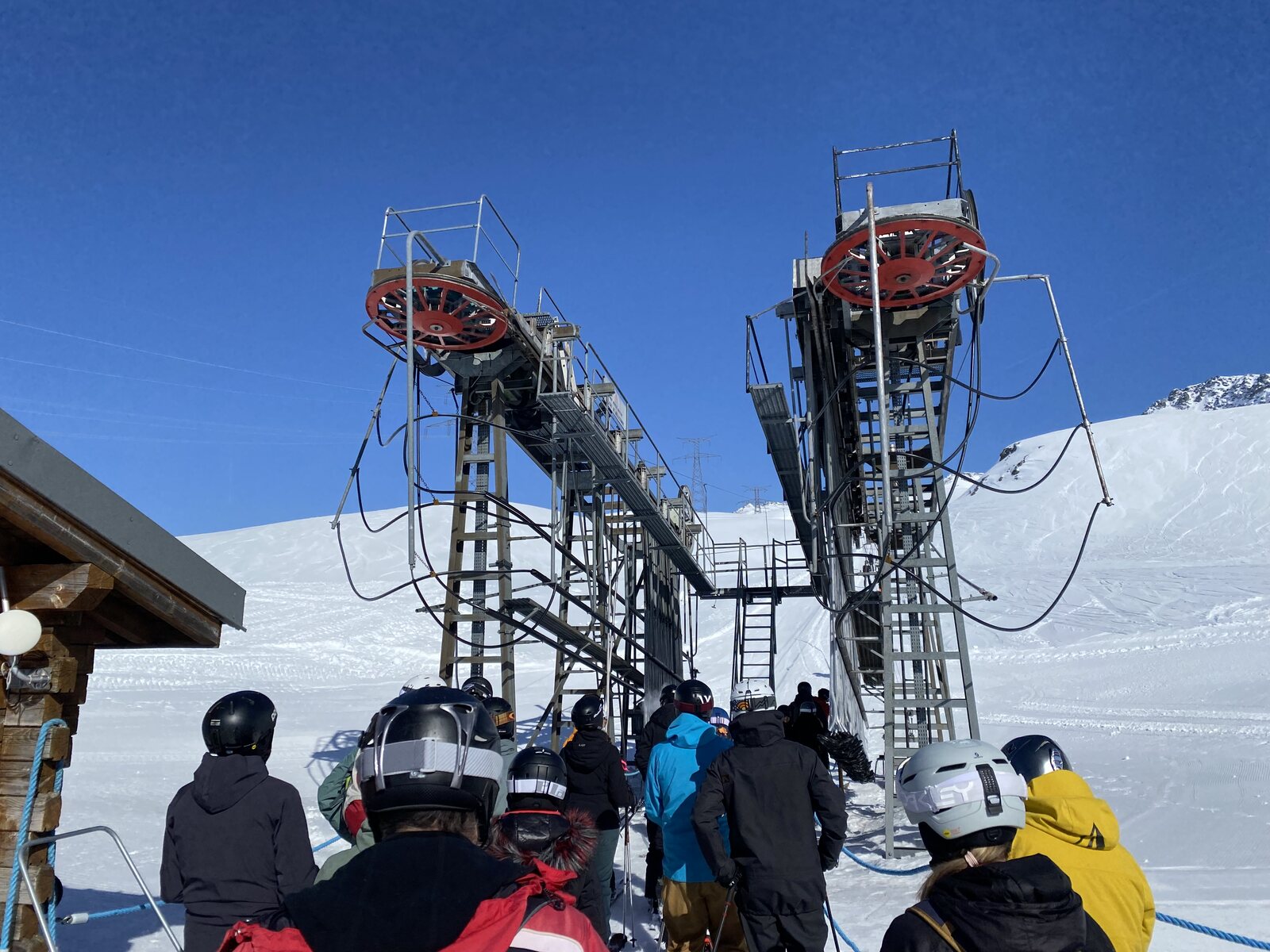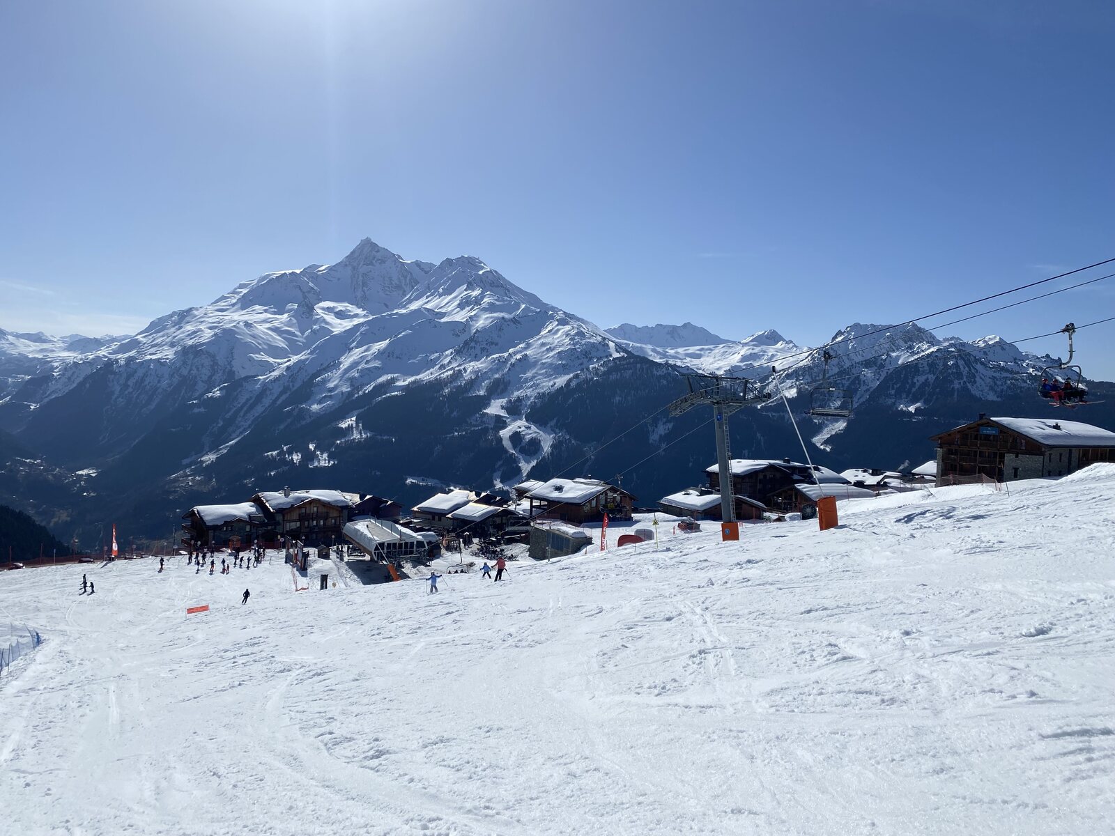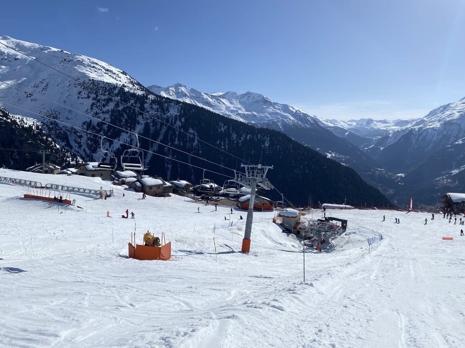 Zwei Sektionen sind hier ein wenig Overkill. Eine hat auch gereicht, das umsteigen wäre mir bei Wiederholungsfahrten etwas nervig. Nett ist allerdings, dass man hier beide Lifte durch Bartholet aus der Schweiz hat errichten lassen. Dazu fühlt man sich mit "Mont Valaisan" ohnehin schon fast wie in der Schweiz. 8-) Auch erwähnenswert ist, dass alle Lifte schön mit 5 m/s laufen, und nicht wie teilweise in der Schweiz und besonders Österreich üblich, auf Sparflamme.