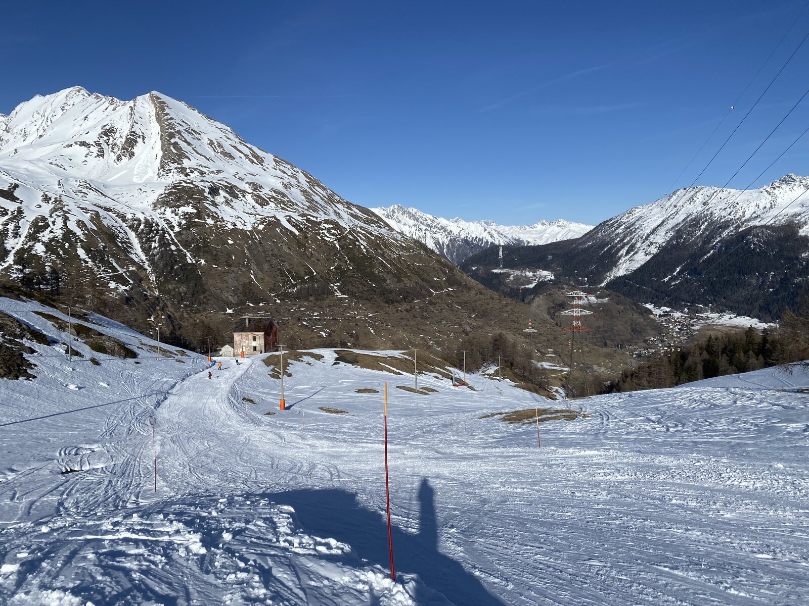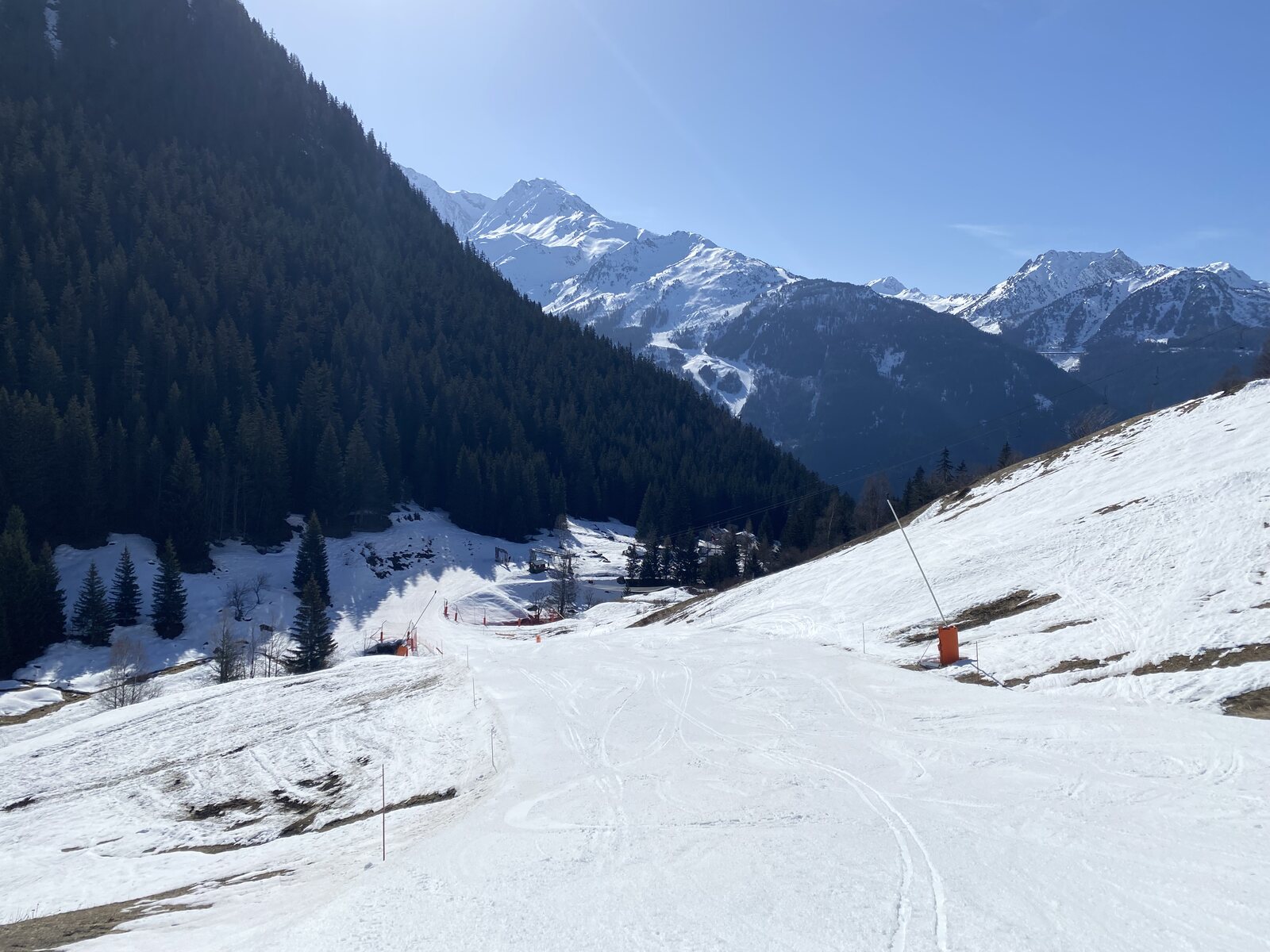 Oben nahm ich an einem Stück der ganz lange Abfahrt über Piste 18 und 6 - an der Talstation der "Arnouvaz" Lift vorbei - zurück nach La Thuile. Daran hatte ich aus 2019 noch so gute Erinnerungen, als ich mit Thorben hier im Skigebiet war. Während die 18 noch gut in Schuss war, war Piste 6 komplett verbuckelt. Mit brennende Beine kam ich unten an. :mrgreen: