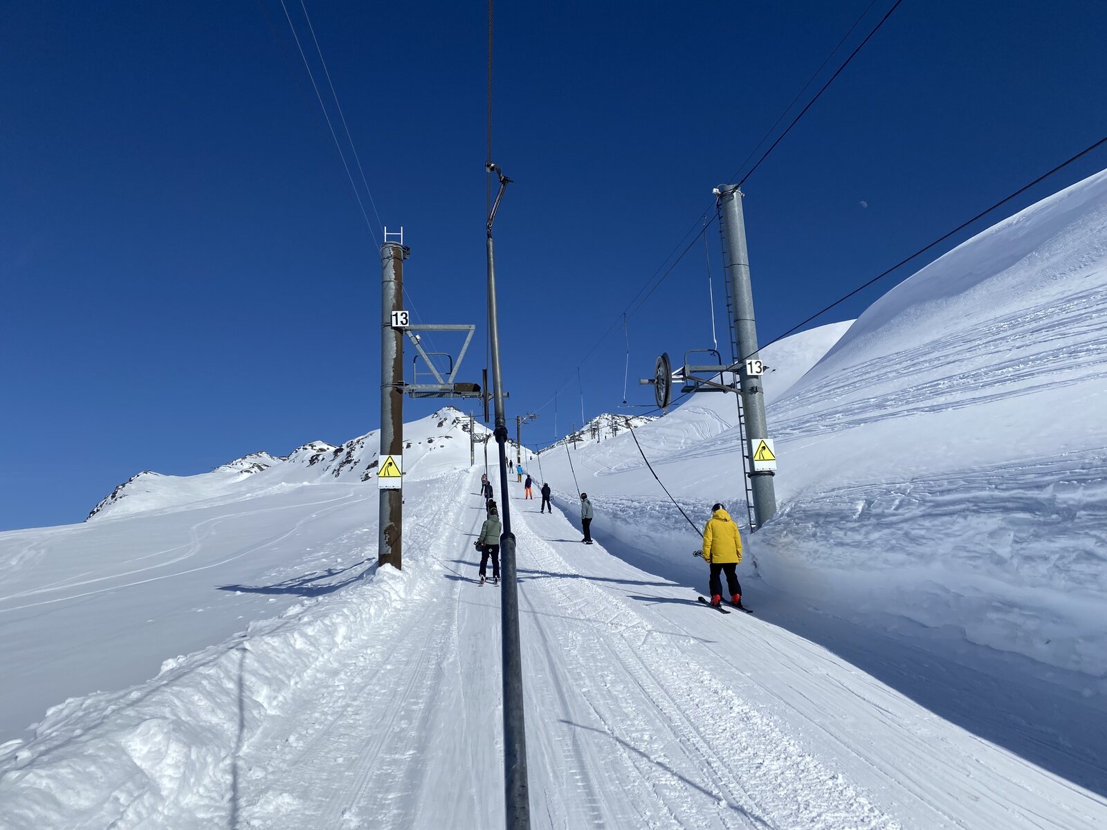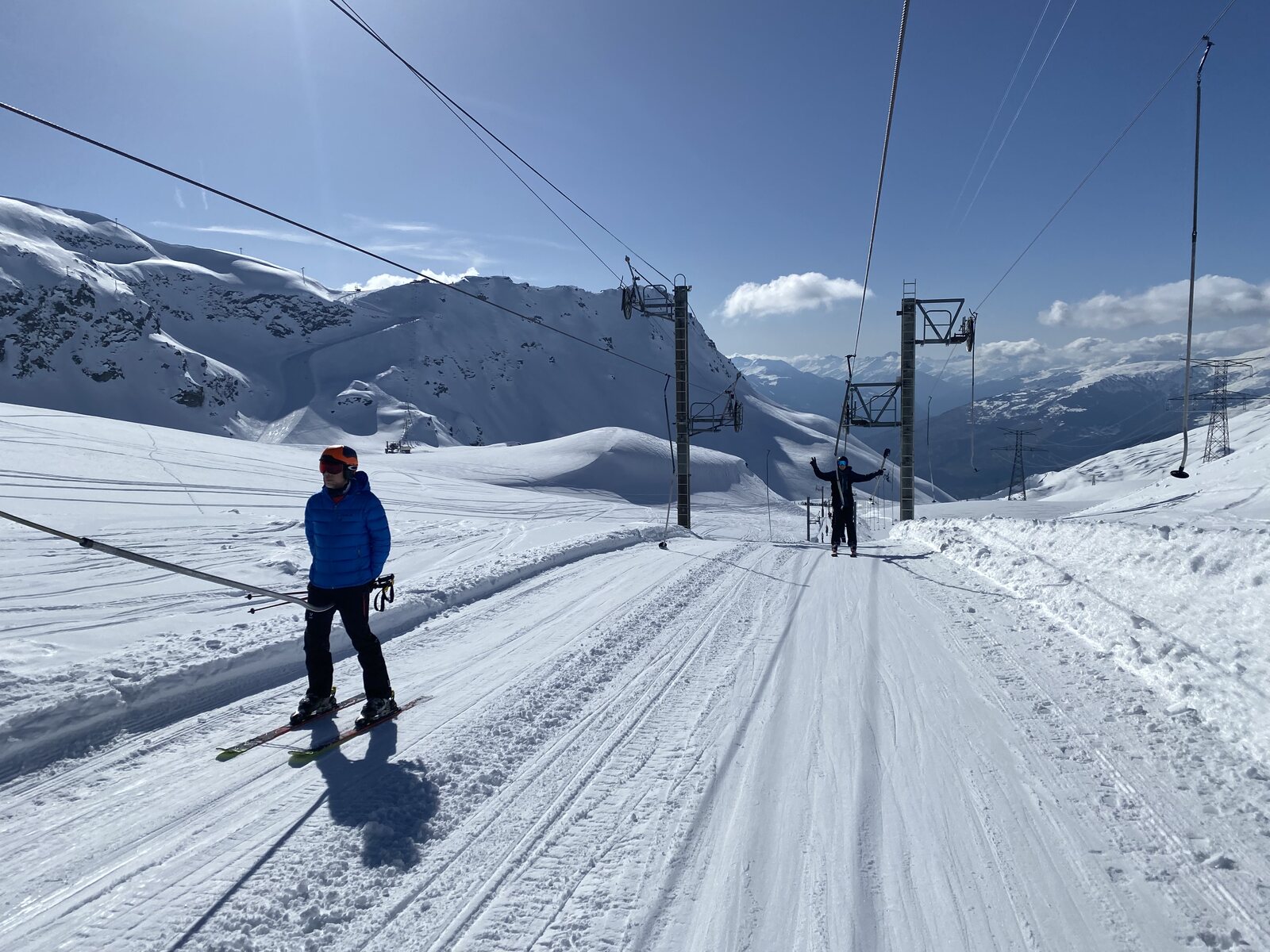 Die Abfahrt "Bouquetin" als Verbindung nach Italien war leider nicht schön zu fahren. Teils buckelig, und dazwischen eisig. Aber wir kommen selbstverständlich gut an der laaaaaange KSSL Stangenschlepper "Bellecombe I + II" an, welche uns zurück nach Italien führen wird. Wir mussten kurz warten, da eine der beiden KSSL Anlagen ein technisches Problem mit dem kuppeln hatte.