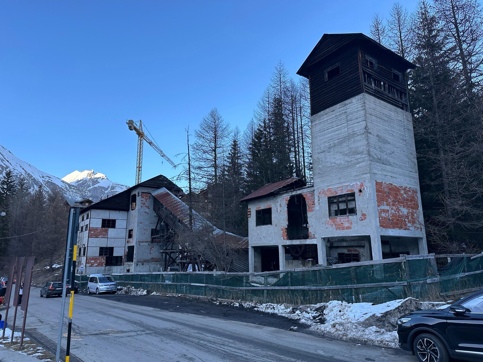 Im oberen Dorfteil versuchen wir ein Parkplatz nahe der Piste zu finden. Leider war aber alles schon entweder voll, Privat, oder viel zu weit laufen. Weitere 20 Min wurden im Sand gesetzt. Am Ende konnten wir nichts anderes machen, als unten im Stau uns geduldig an zu schliessen. Auf der Franzione Entreves - der Weg zur Talstation - ging es kaum Vorwärts. Vergib uns, dass wir dann im Auto auch mal fluchen mussten. Was soll das alles doch bloss? Ist hier soviel los?! Im Kopf sehe ich die schön präparierte Pisten auf unsere ersten Abfahrt schon komplett verbuckelt und uns auch am Lift ewig anstehen. Nach wiederum etwa 20 min erreichen wir endlich der mittlerweile volle Parkplatz an der Talstation. Aber was macht jedes Auto mit Italienisches Kontrollschild vor uns? Mit dem Parkwächter diskutieren ob nicht doch noch ein Platz frei ist. Es blieb aber jedes Mal beim Nein mit der Aufforderung: "Weiter fahren!" Und Schwupps war der 'Stau' nach dem (gebührenpflichtigen) Hauptparkplatz ins Nichts aufgelöst. Dafür standen hunderte Meter lang Autos am Strassenrand kreuz und quer parkiert. Halteverbot, ausserhalb Parkflächen, auf dem Trottoir... alles egal. In Italien wird einfach ohne Rücksicht parkiert. Wir fahren weiter bis zur ersten richtigen freien Parkplatz, der "Parcheggio comunale", direkt gegenüber von einen verfallenen Fabrikanlage "La Laveria". Dort hatte es noch mächtig Platz.