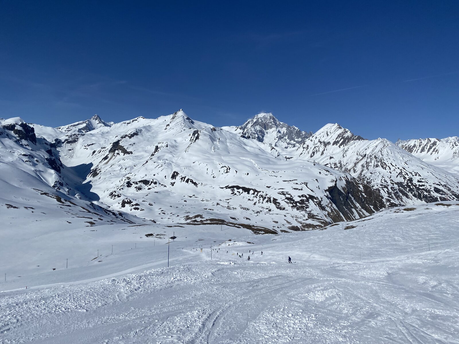 Das Panorama oben auf dem Mont Valaisan ist bombastisch. Natürlich mit direkten Blick auf dem Mont-Blanc (4805 m), das Dach der Alpen. In andere Richting aber auch bis nach Les Arcs, La Plagne und L3V!
