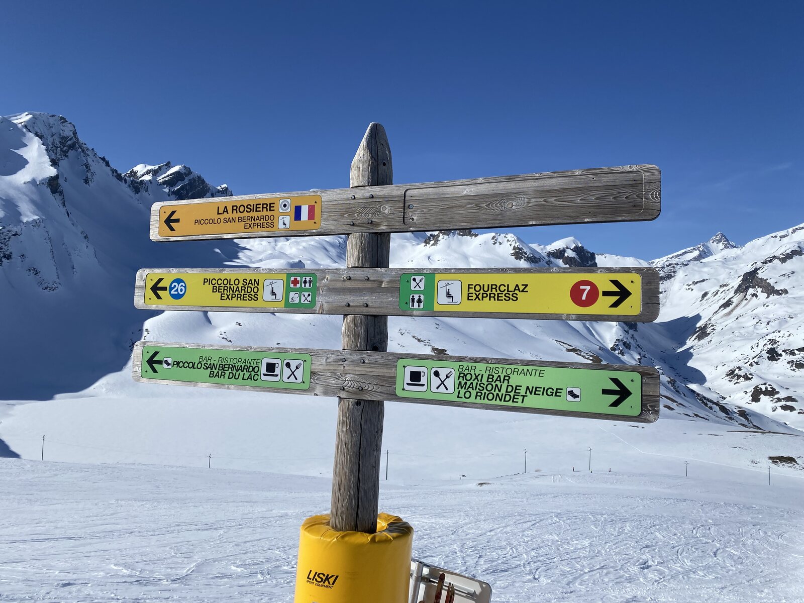 Wir fahren hinunter über Piste 22 zur 4-KSB "Piccolo San Bernardo Express" von Leitner, der auf der Passhöhe der kleine Sankt Bernardpass liegt. Zusammen mit dem "Fourcolaz Express" nebenan, die einzigste Sesselbahn im Gebiet mit Hauben. Und ja, ihr habt richtig gelesen, in Italien haben Pisten wieder eine Nummer anstatt einen Namen. So merkt man sofort, dass man wieder in ein anderes Land ski fährt.