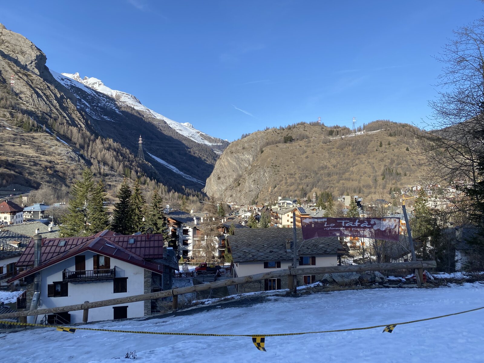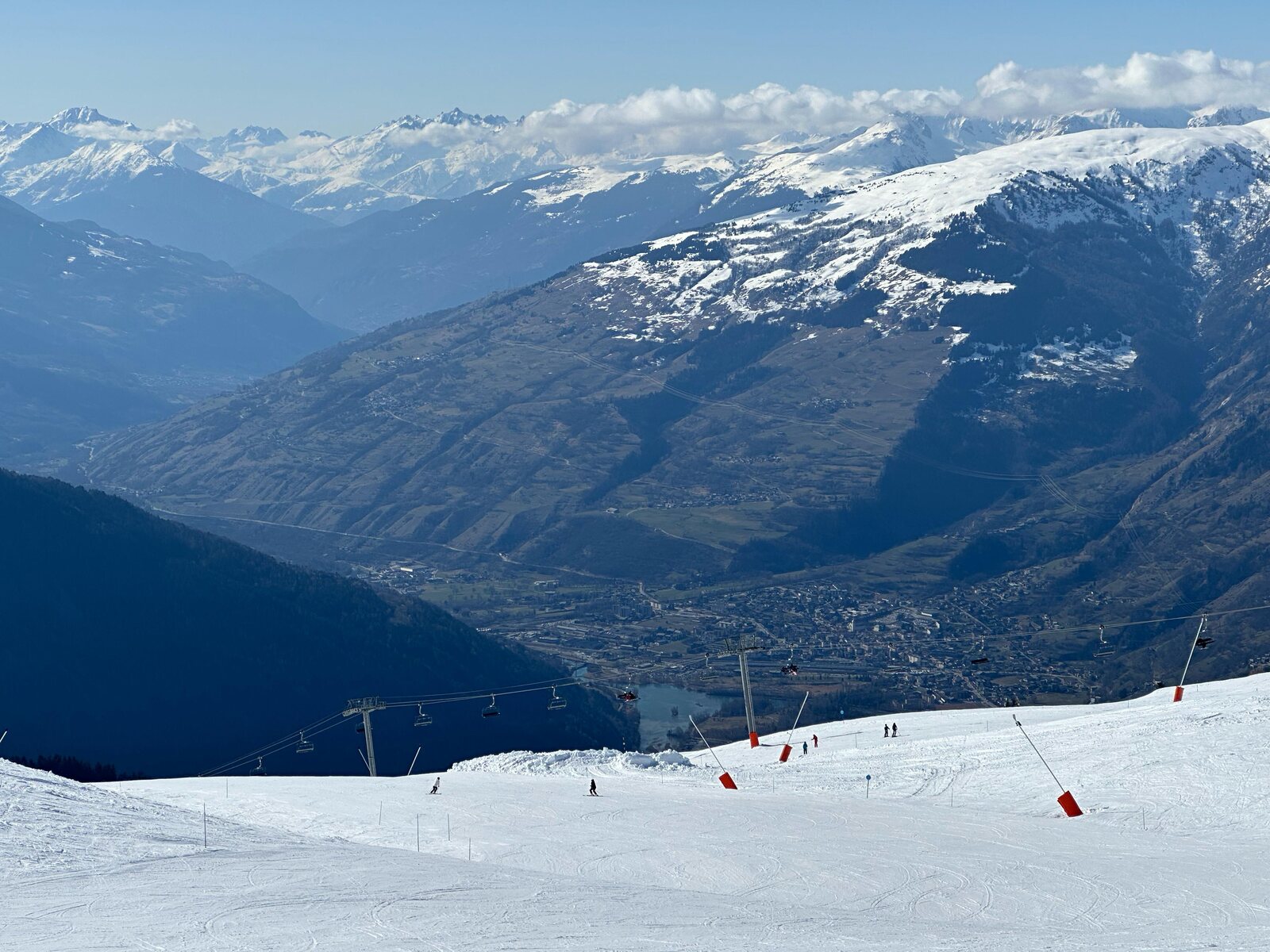Unterwegs hat man Ausblick hinunter nach Bourg-Saint-Maurice, wo ich in 2019 am Ostersonntag mit Graubündenfan für einen Tag ins Skigebeit von Les Arcs und La Plagne (Paradiski) gestartet bin. Das ist übrigens sehr weit und lästig aus der Deutschschweiz zu erreichen. La Thuile ist Dank der Sankt Bernardtunnel schon viel einfacher.